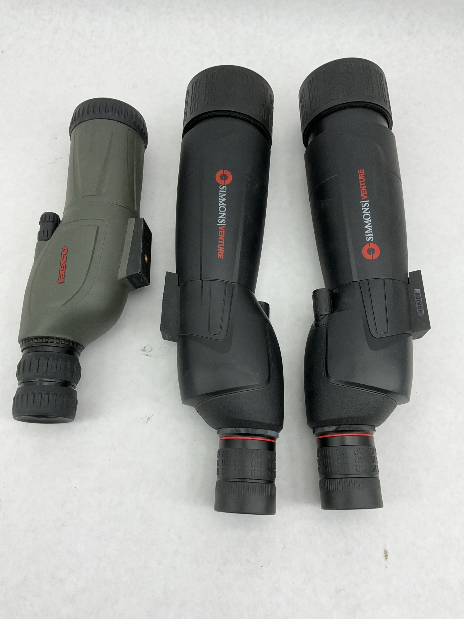 Set of three spotting scopes. Two Simmons Venture and one Tasco.