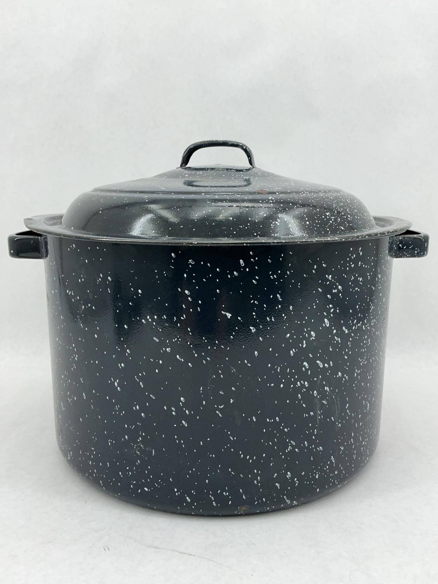 Large speckled enamelware stock pot with lid. Black with white speckles. Features handles on either side. Minor dents and scratches.