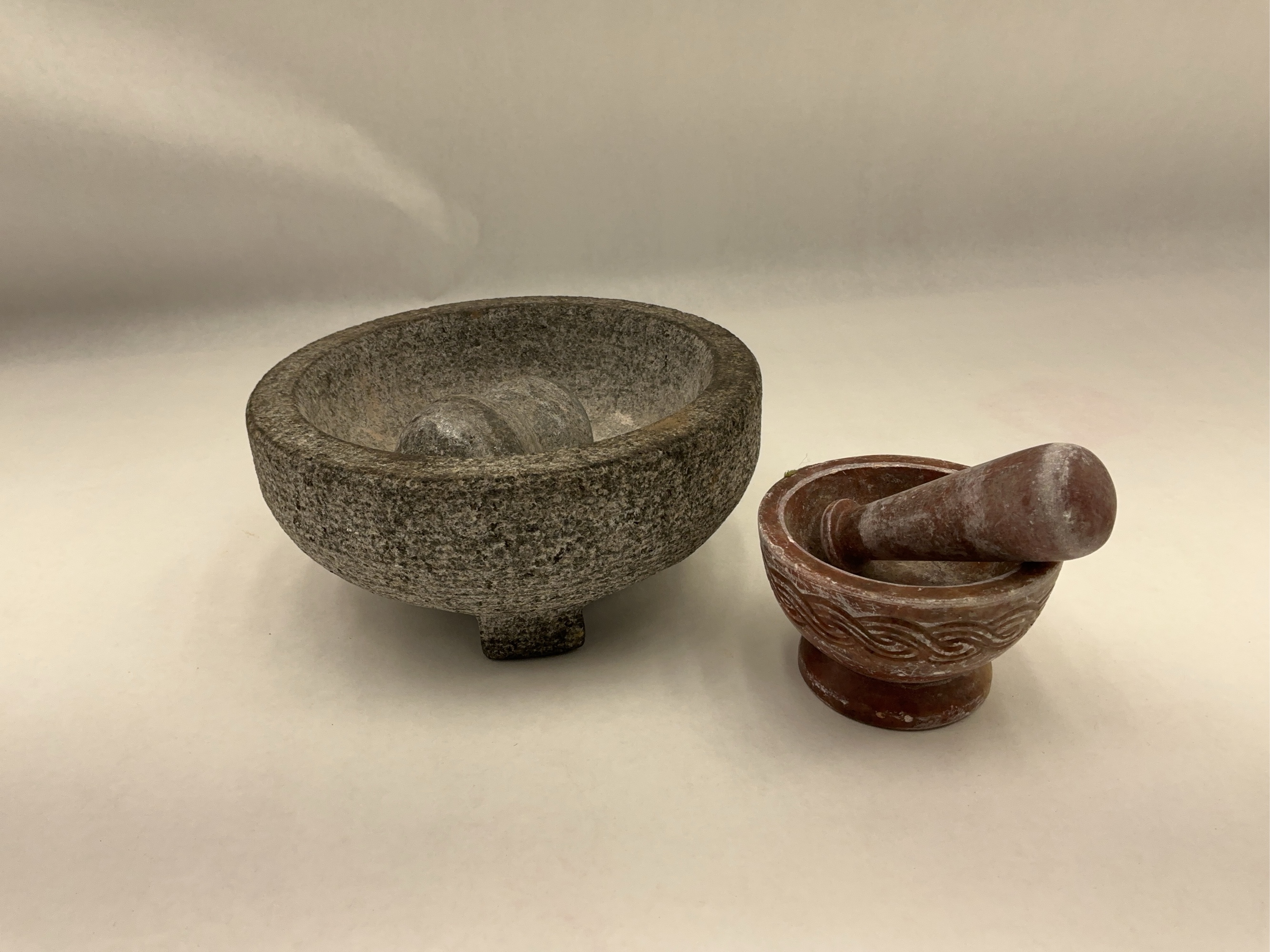 This lot features two mortar and pestle sets. The large bowl is approximately 8 inches in diameter, and the small bowl is approximately 4 inches in diameter.
