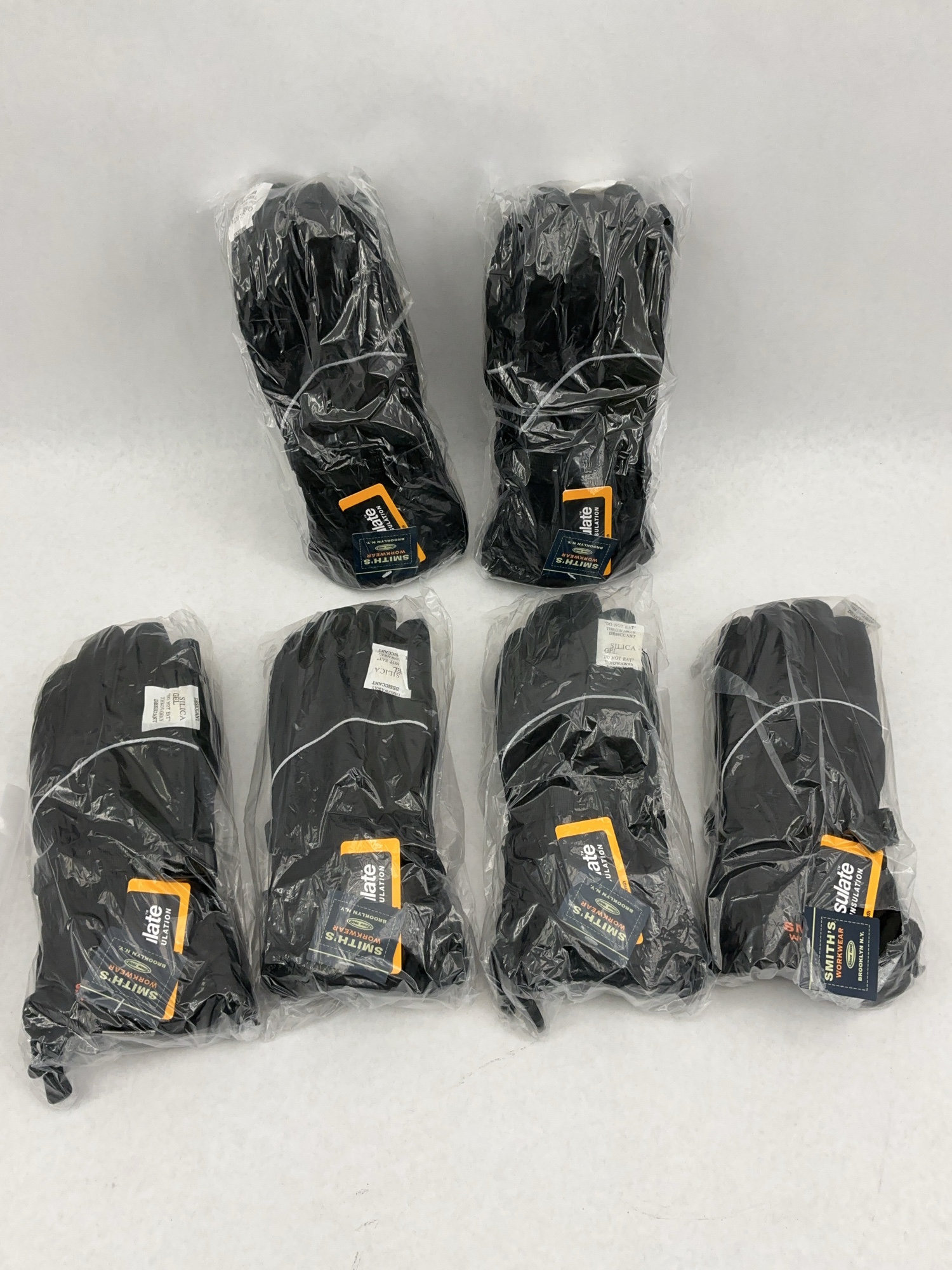 This lot includes seven pairs of Smith's Workwear gloves, featuring insulation for warmth. All gloves are black.