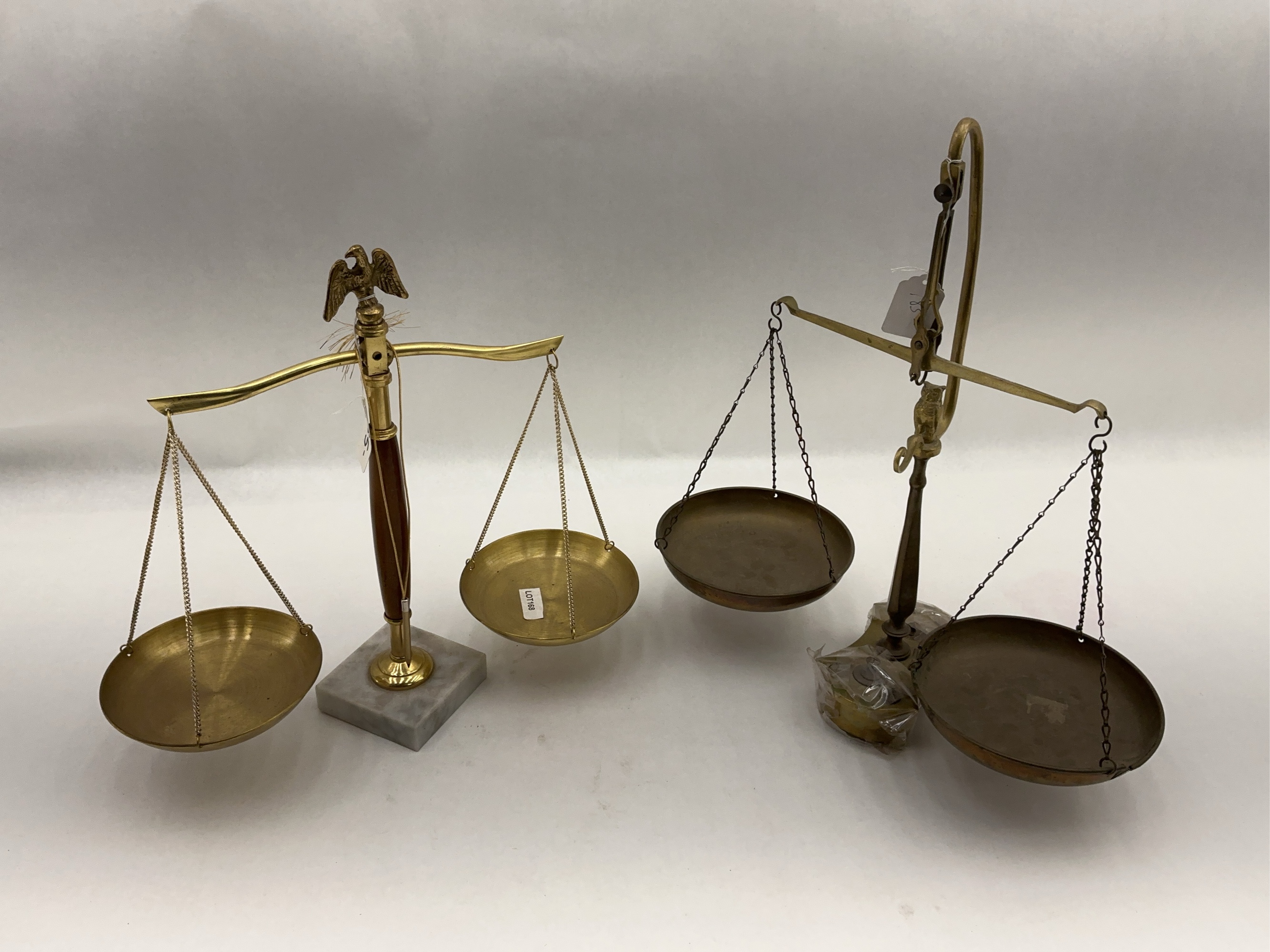 Two decorative balance scales. One scale has an eagle design on top, a wooden handle, and a marble base. The other has an owl design at the top. Missing balance screw.