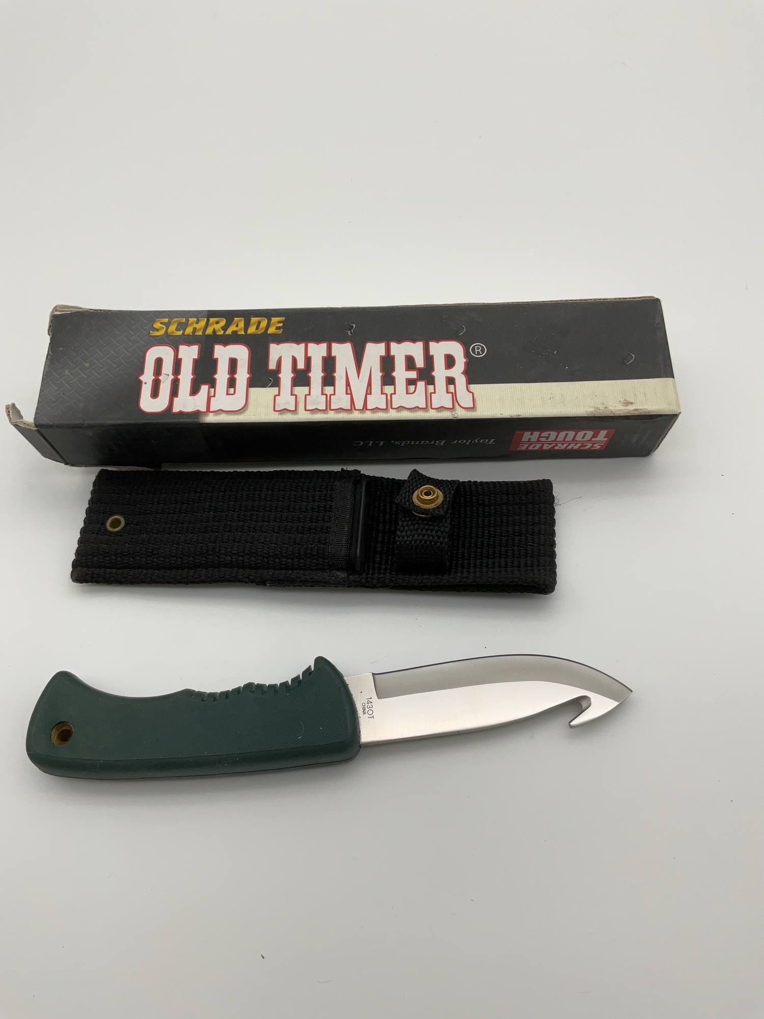 This is a single Schrade Old Timer gut hook knife, measuring 9 inches in length. It comes with a black sheath.