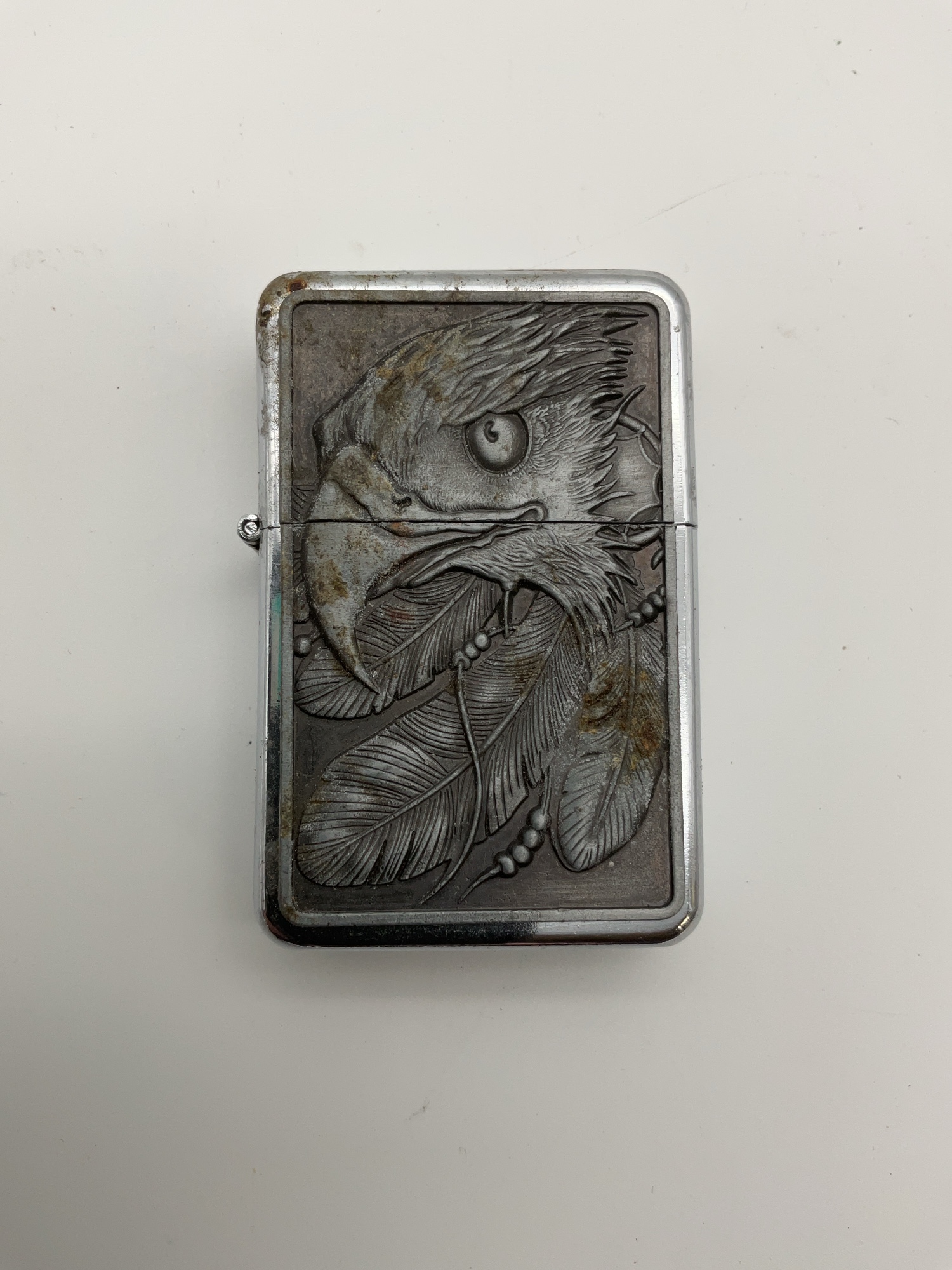 Lighter with engraved eagle and the Start-1 logo. Untested, but does spark. Features feather details.