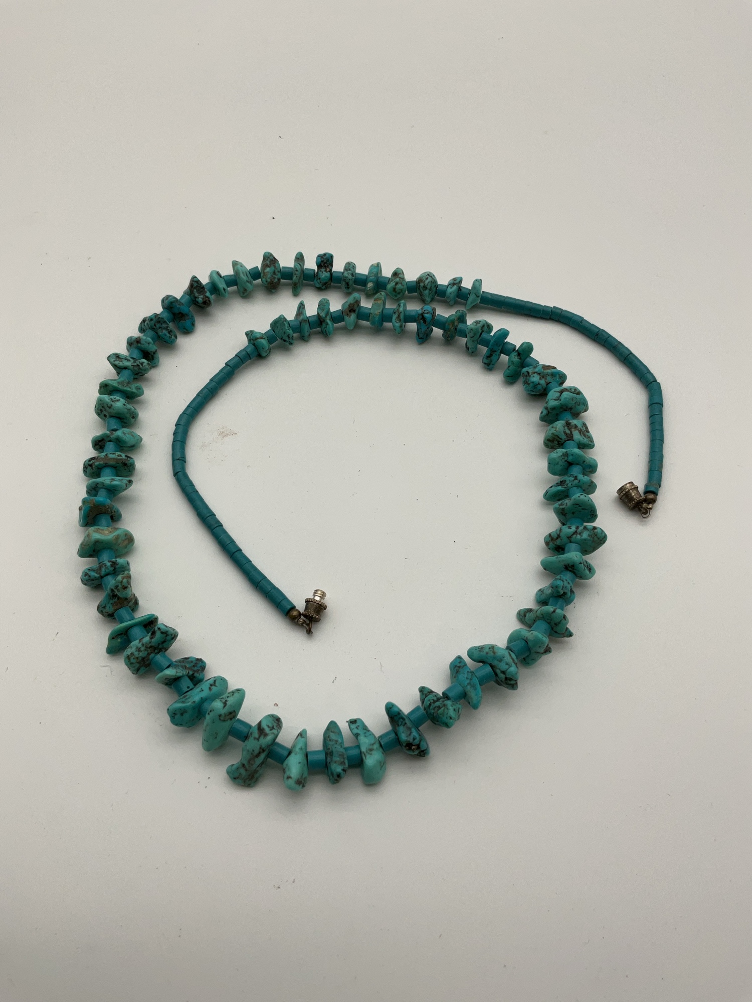 Necklace with turquoise color stones. Authenticity unknown. Measures 13” top to bottom.