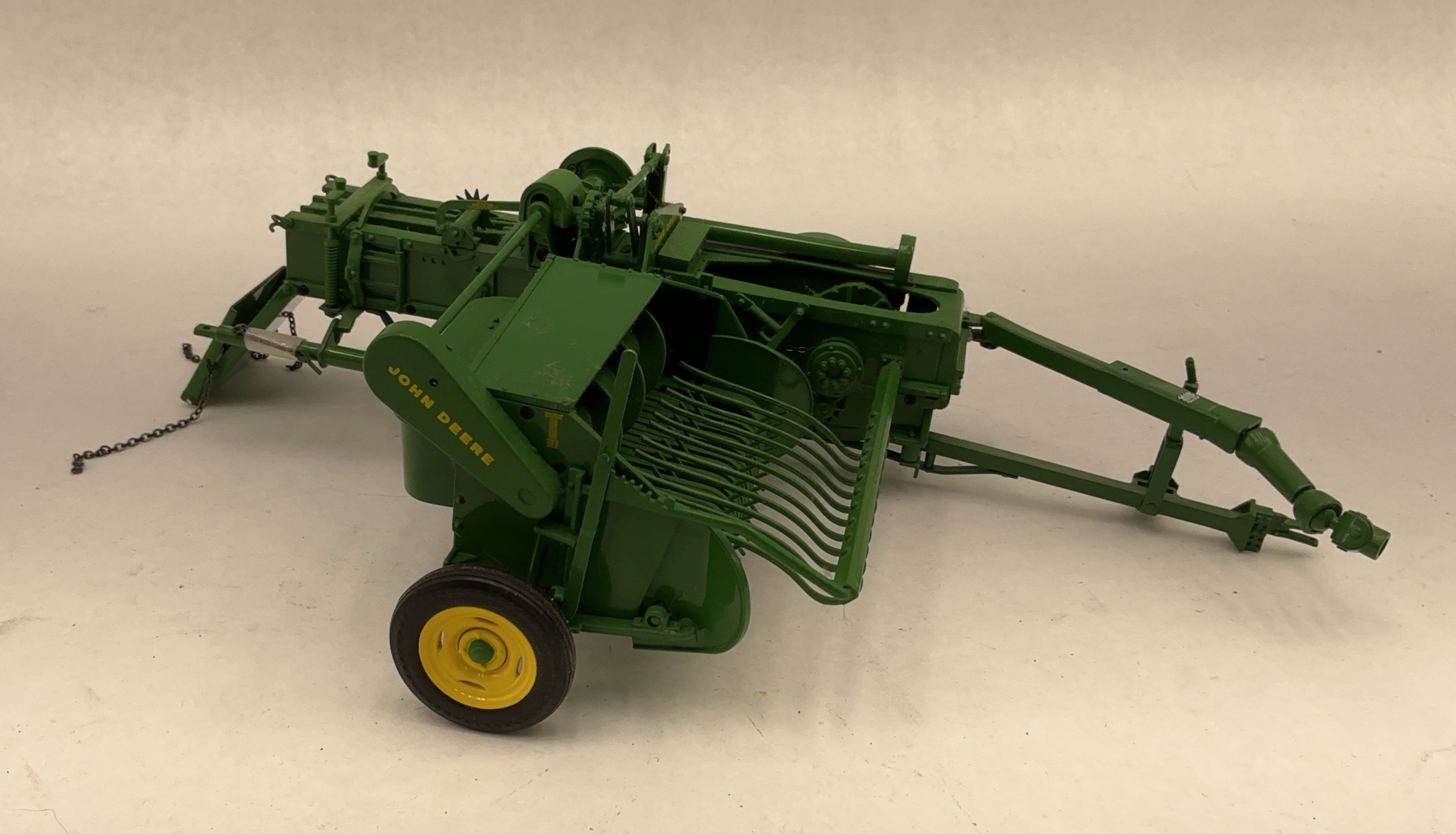 This lot features an Ertl John Deere 3527GD hay baler model and a commemorative medal. The model measures approximately 13x6x2.