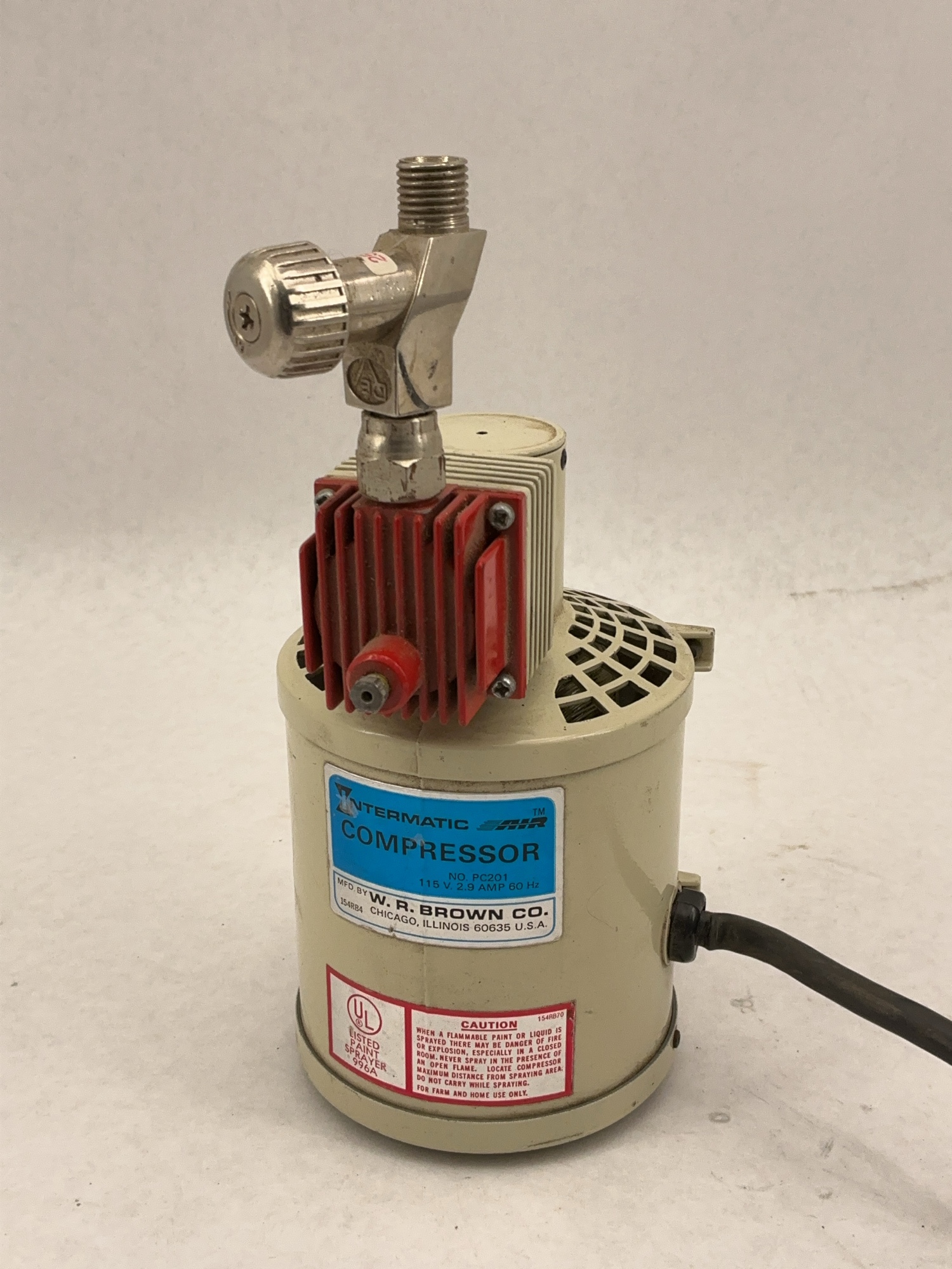 This is a Intermatic Air Compressor, model PC201, manufactured by W.R. Brown Co. It operates at 115V, 2.9AMP, 60Hz. This compressor is for farm and home use only.