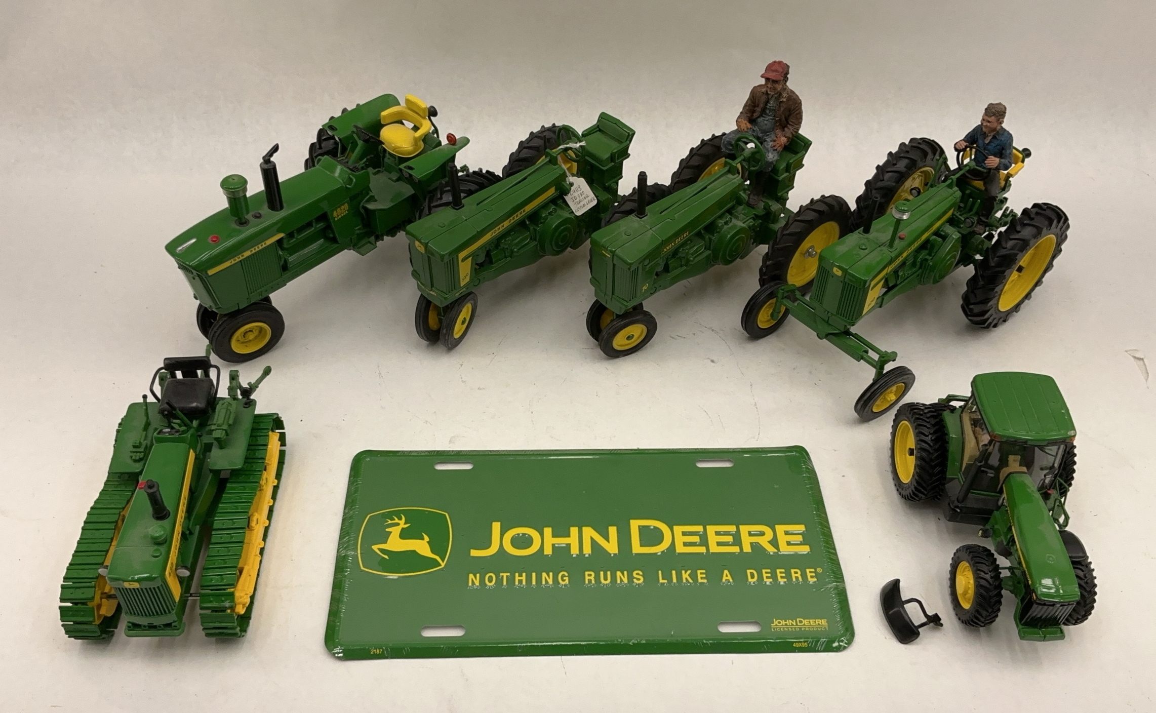 Collection of John Deere farm tractor toys. Includes a 70, 720, 4020, and 8100 John Deere tractors. Includes a John Deere license plate and figures.