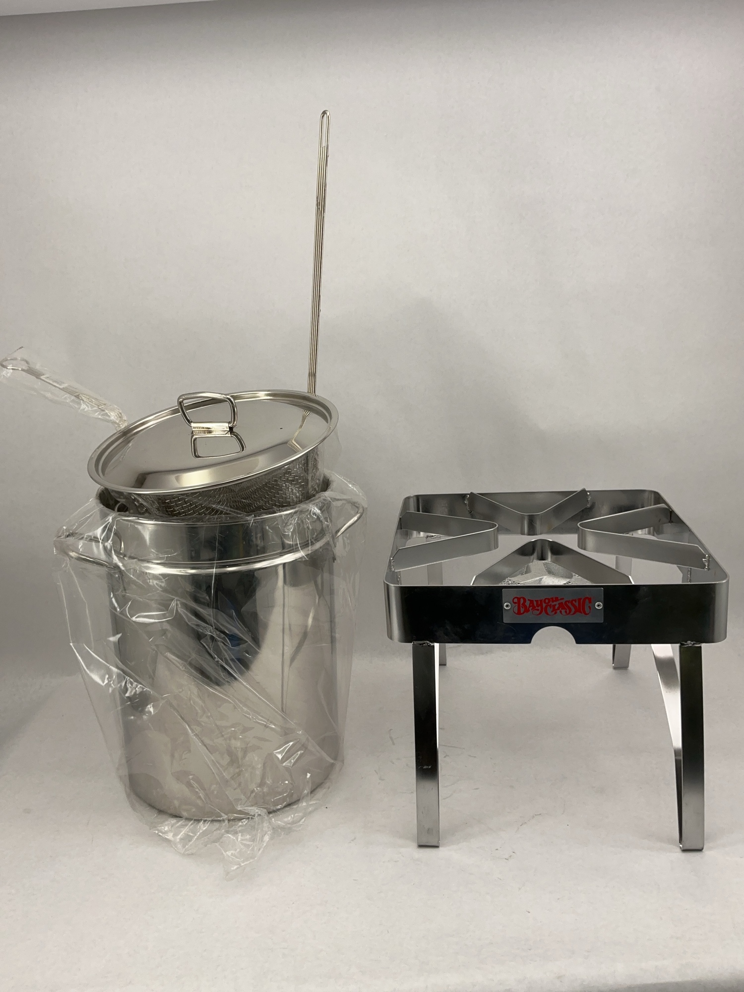 Complete outdoor cooking set from Bayou Classic, featuring a stainless steel pot, burner, and assorted cooking accessories.