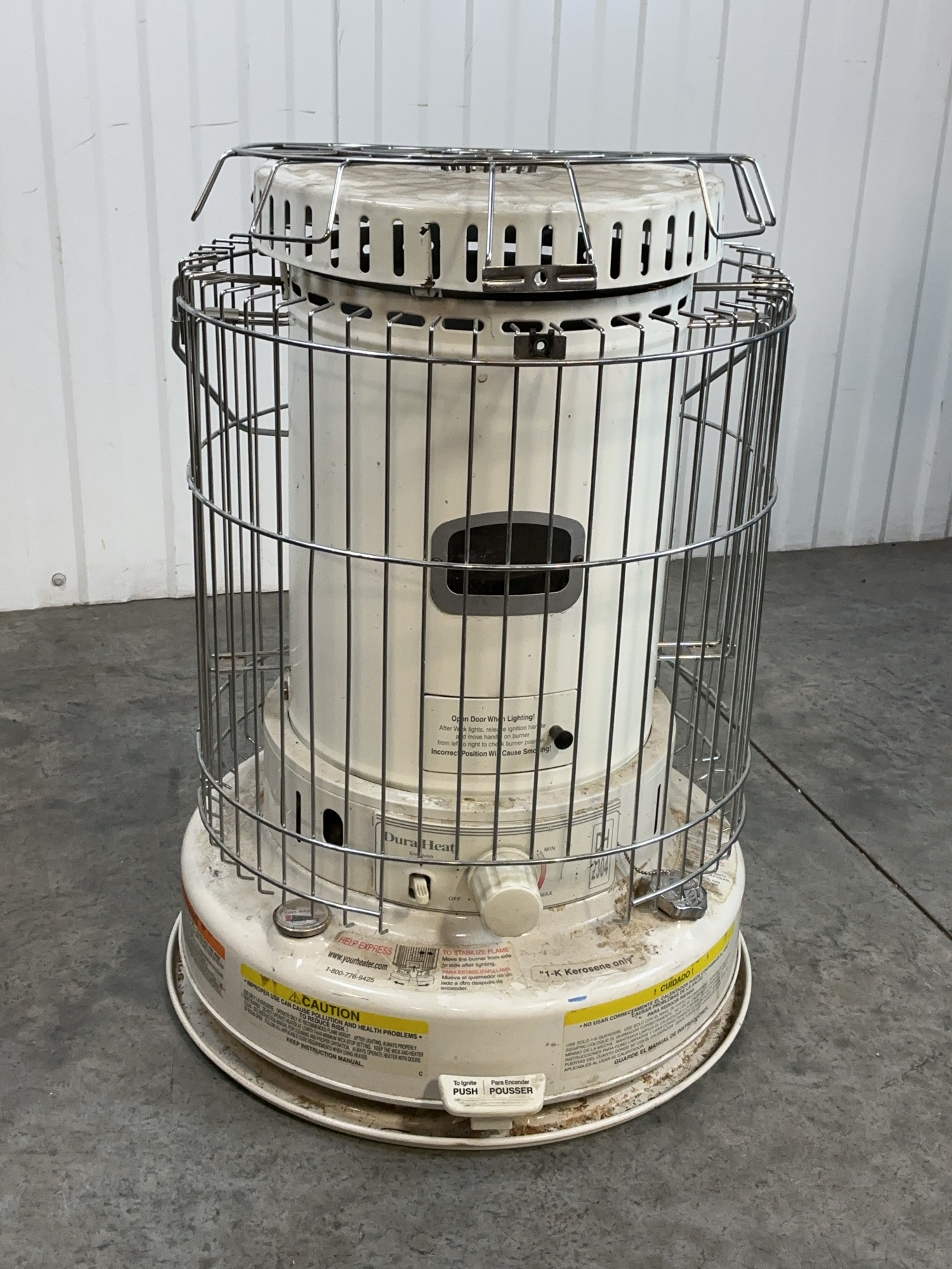 Dura Heat kerosene heater. Top diameter 11 inches. Base diameter 18 inches. 24 inches tall. Untested. Black scuff mark towards base.