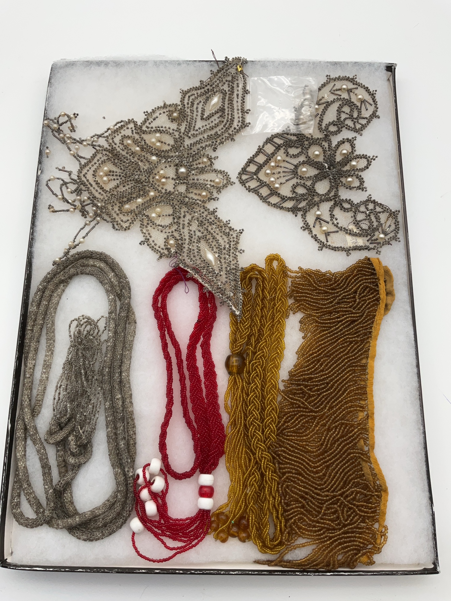 Collection of various beaded appliques and trim pieces. These appear to be for clothing decoration.