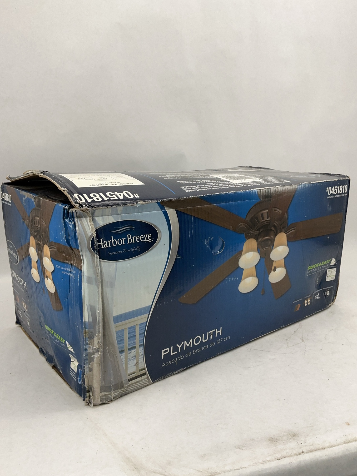New in box Harbor Breeze Plymouth 50-inch bronze finish ceiling fan. Model #CPK1237.