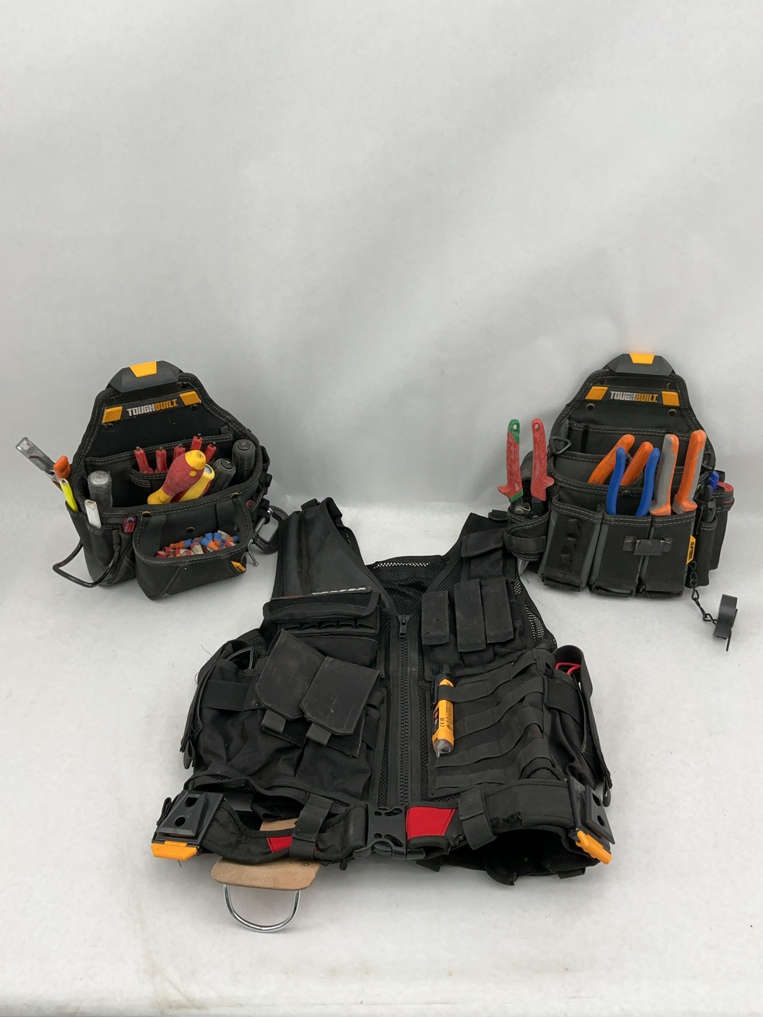 Tool vest with a name, and two Toughbuilt tool pouches with multiple pockets for easy tool organization.