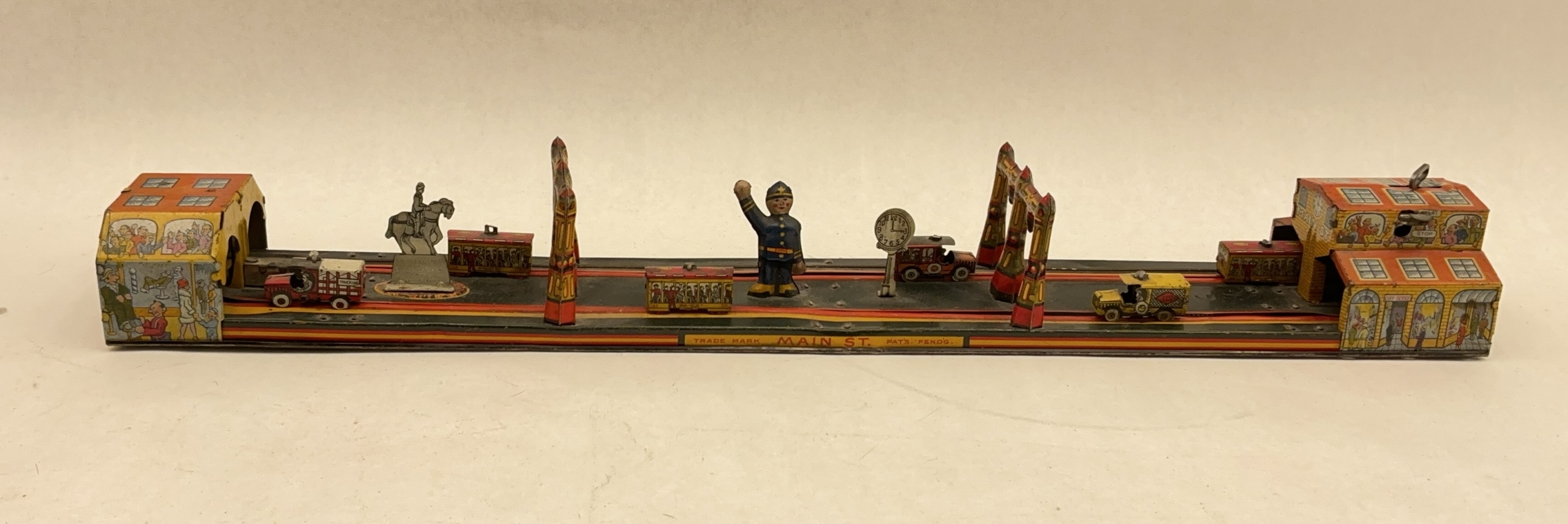 Louis Marx Main Street wind-up toy with vibrant tin lithography. When wound, this detailed piece showcases moving figures and cars along a Main Street scene. Approximate dimensions: 24x4x3.