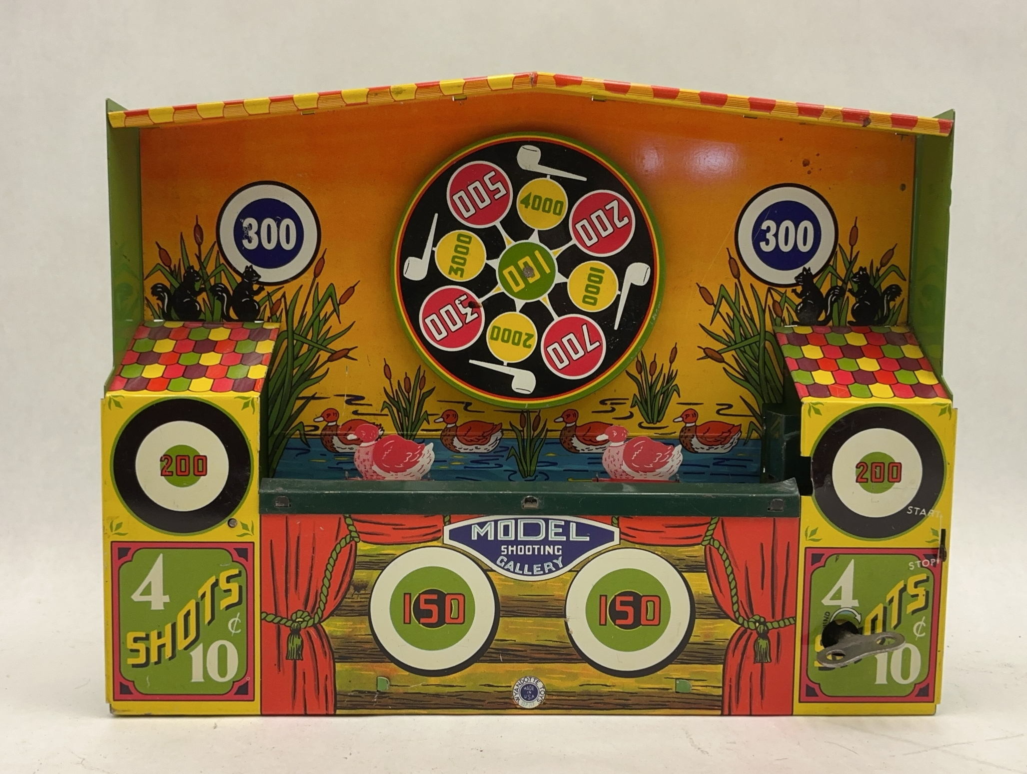 Wyandotte Toys Model Shooting Gallery Tin Toy with duck target. The shooting gallery measures approximately 14x3x10 inches.