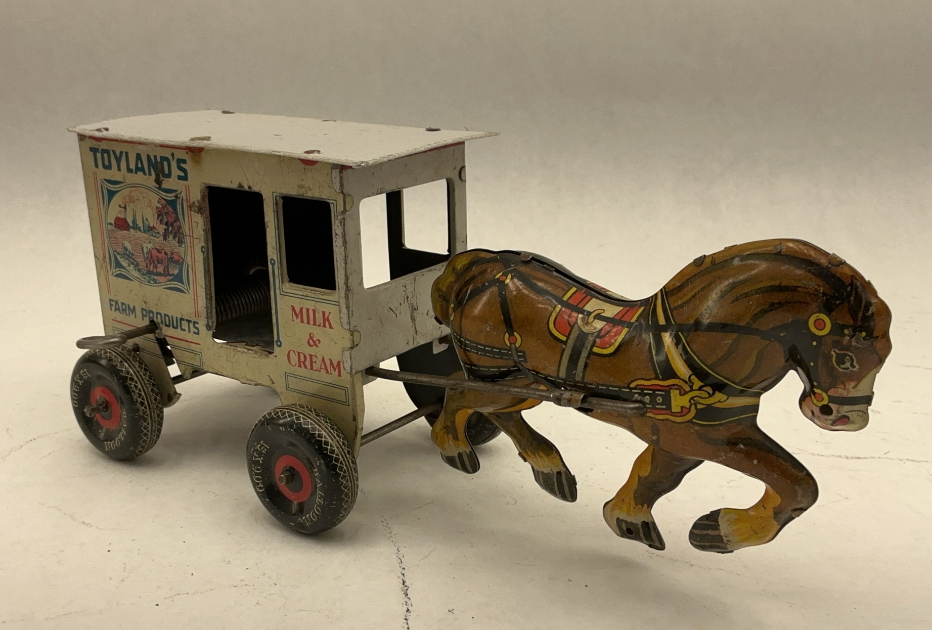 Toyland's Milk & Cream Farm Products tin wagon, featuring a horse drawn design. Made by MAR Toys. Measures approximately 10x4x5.