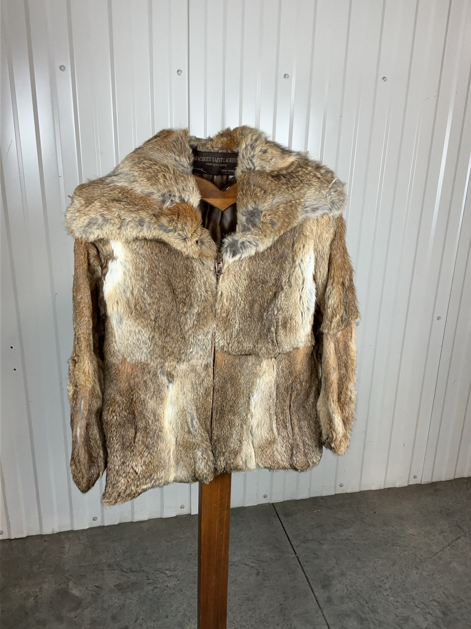 Jacques Saint Laurent rabbit fur jacket. Fur worn around collar. Inside of jacket some discoloration on bottom.