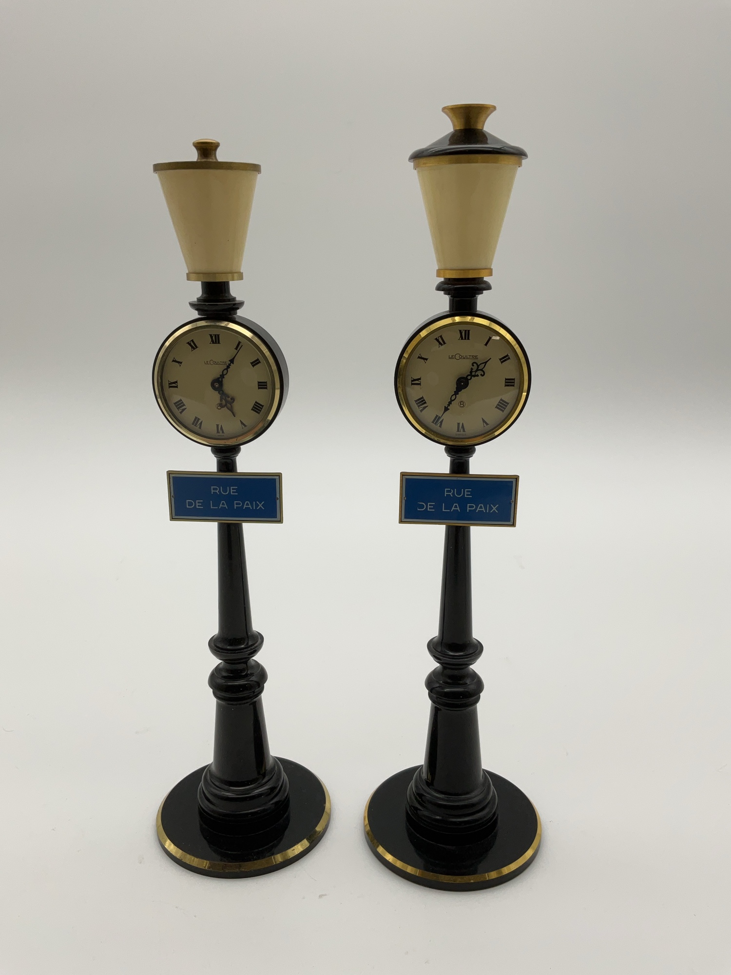 Pair of clocks, look like French lampposts. Not matching, 11” tall. Feature 'Rue De La Paix' signs.