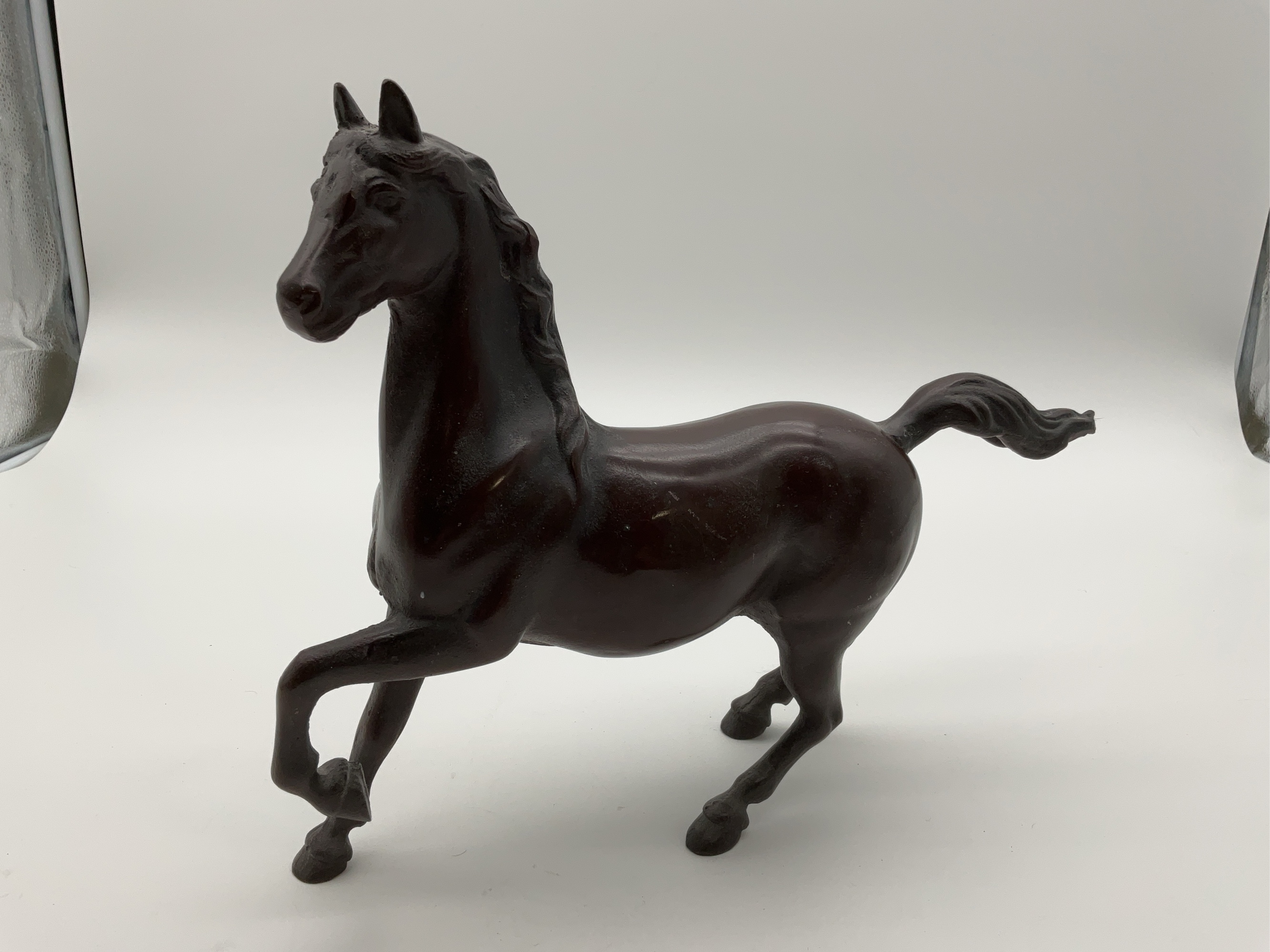 Metal horse. Heavy. Stands 11.5” tall and is 15” wide. No maker’s mark.
