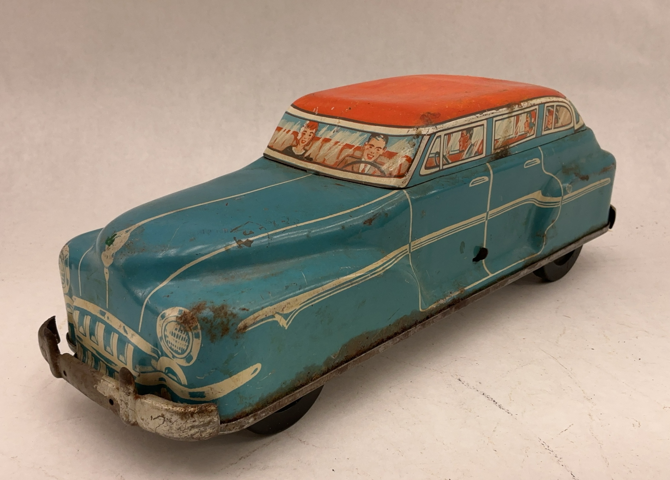 Wolverine pressed steel wind up sedan toy car. Features a lithographed exterior and an orange roof. Measures approximately 13x5x5.