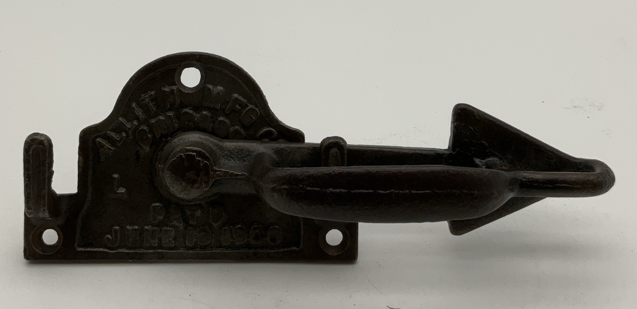 Black metal gate latch by Allith Mfg of Chicago. Measures 7.5” wide by 3” tall. Functional.