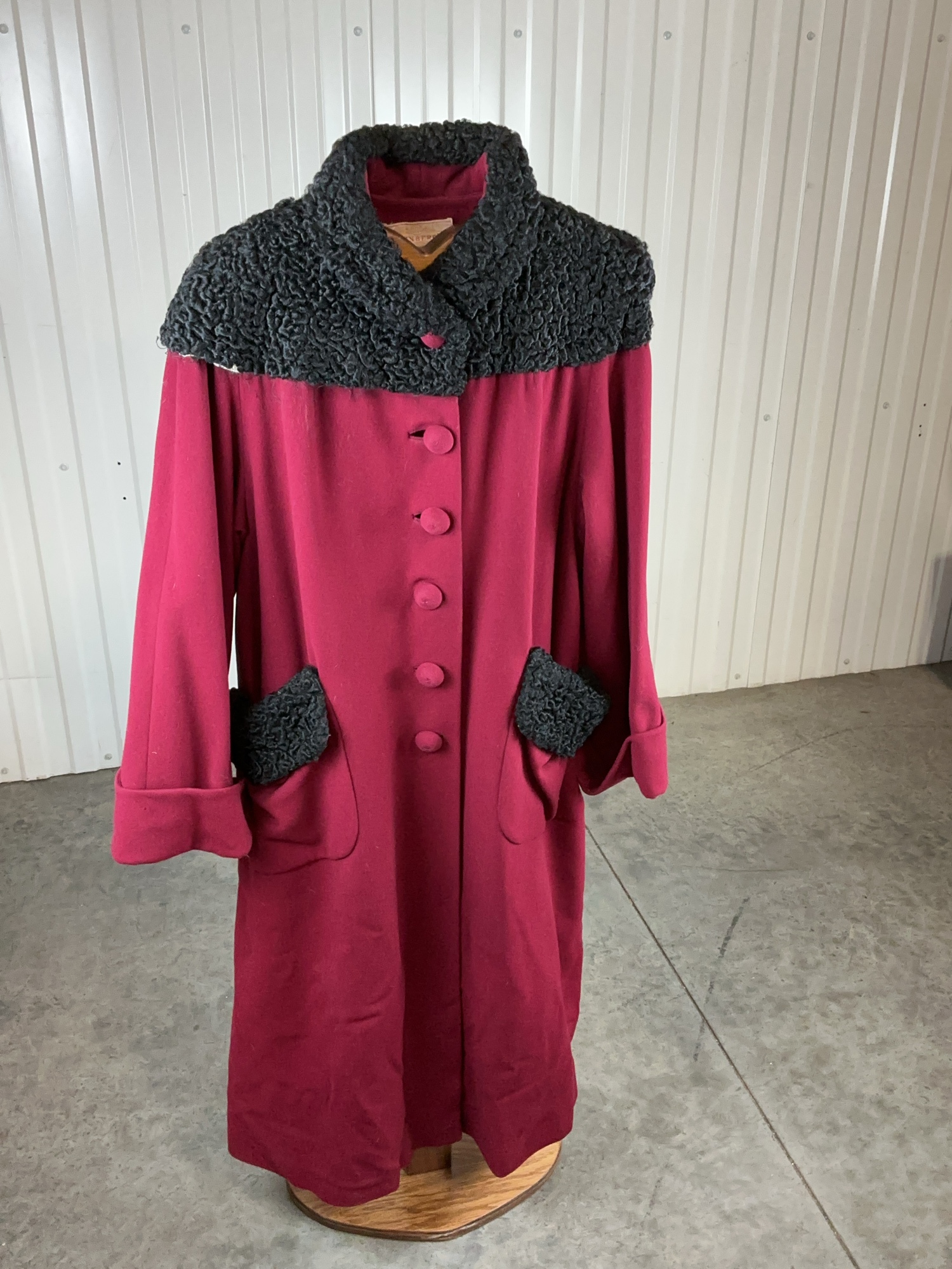 Burgundy colored coat with a button-down style and a black collar. Features pockets. Black collar is detaching from coat.