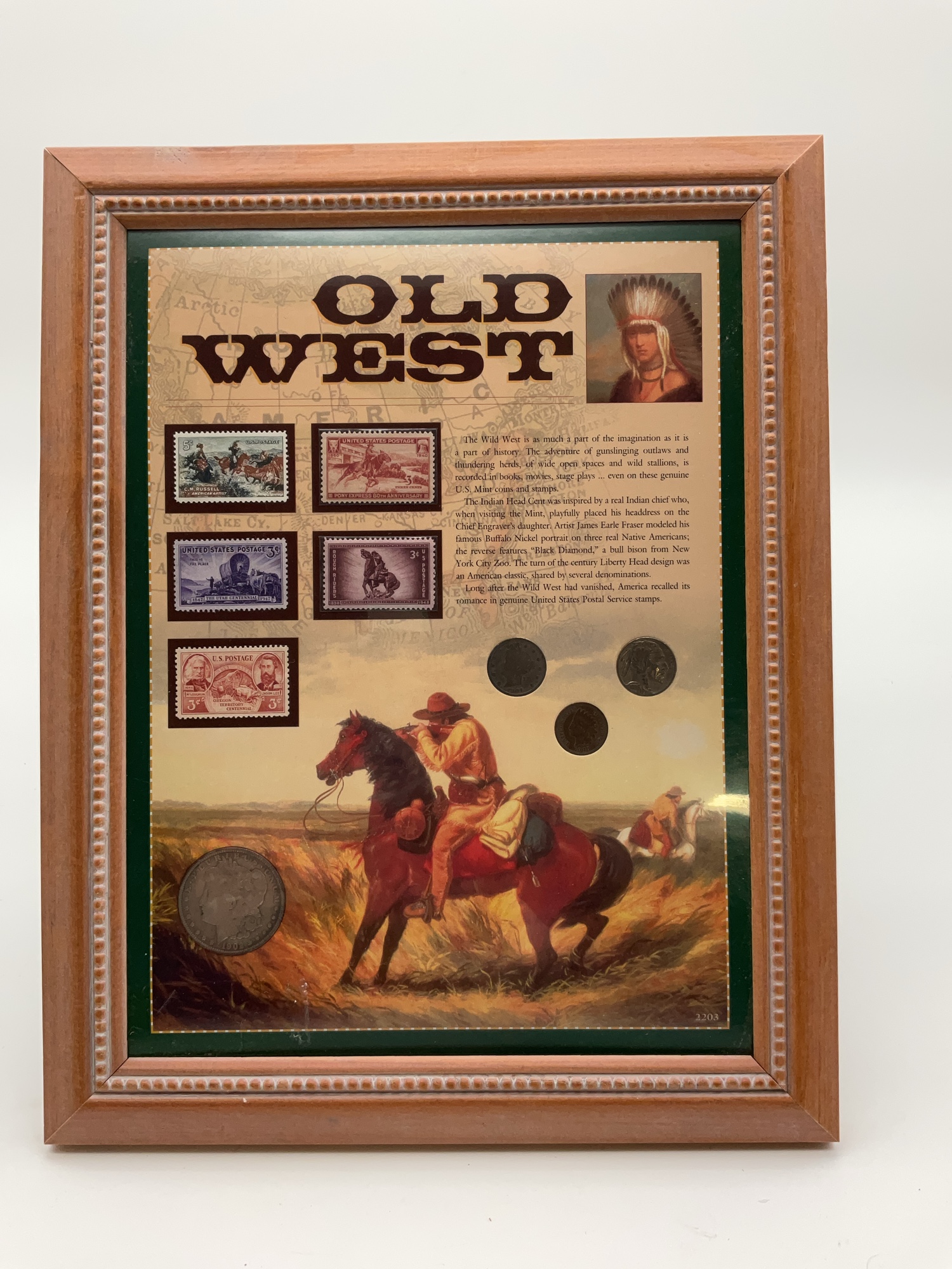 Old West postage stamp collectors piece. Features a 5cent C.M. Russell, a 3 cent Pony Express, 3 cent Utah Centennial, 3 cent Rough Riders and a 3 cent Oregon Territory. As well as a 1902 silver dollar, an Indian head nickel, an Indian head penny and a 1907 dime. Framed in glass in an 11 x14 frame.