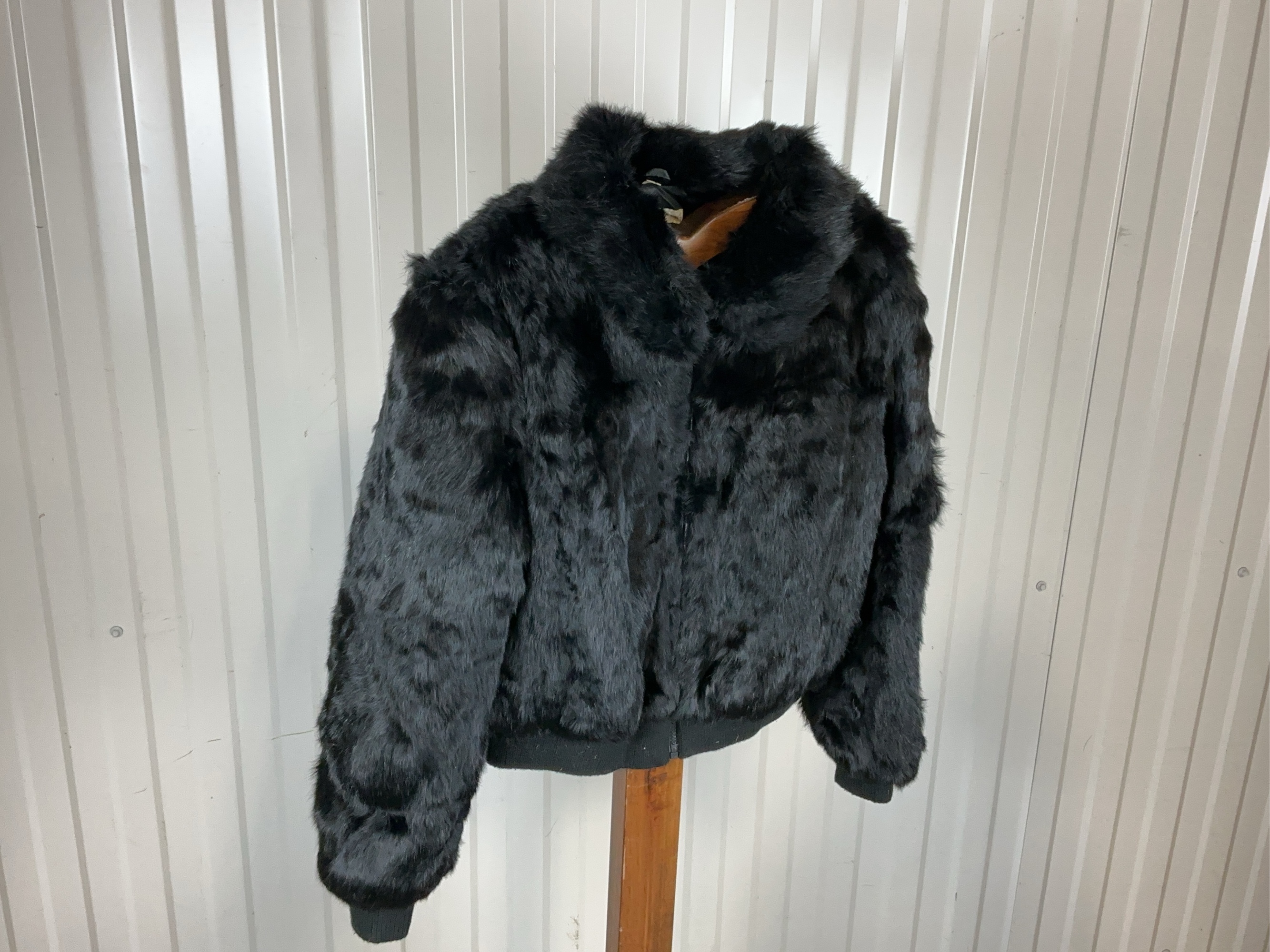This is a black fur jacket with a bomber jacket style. The jacket was made in Hong Kong.