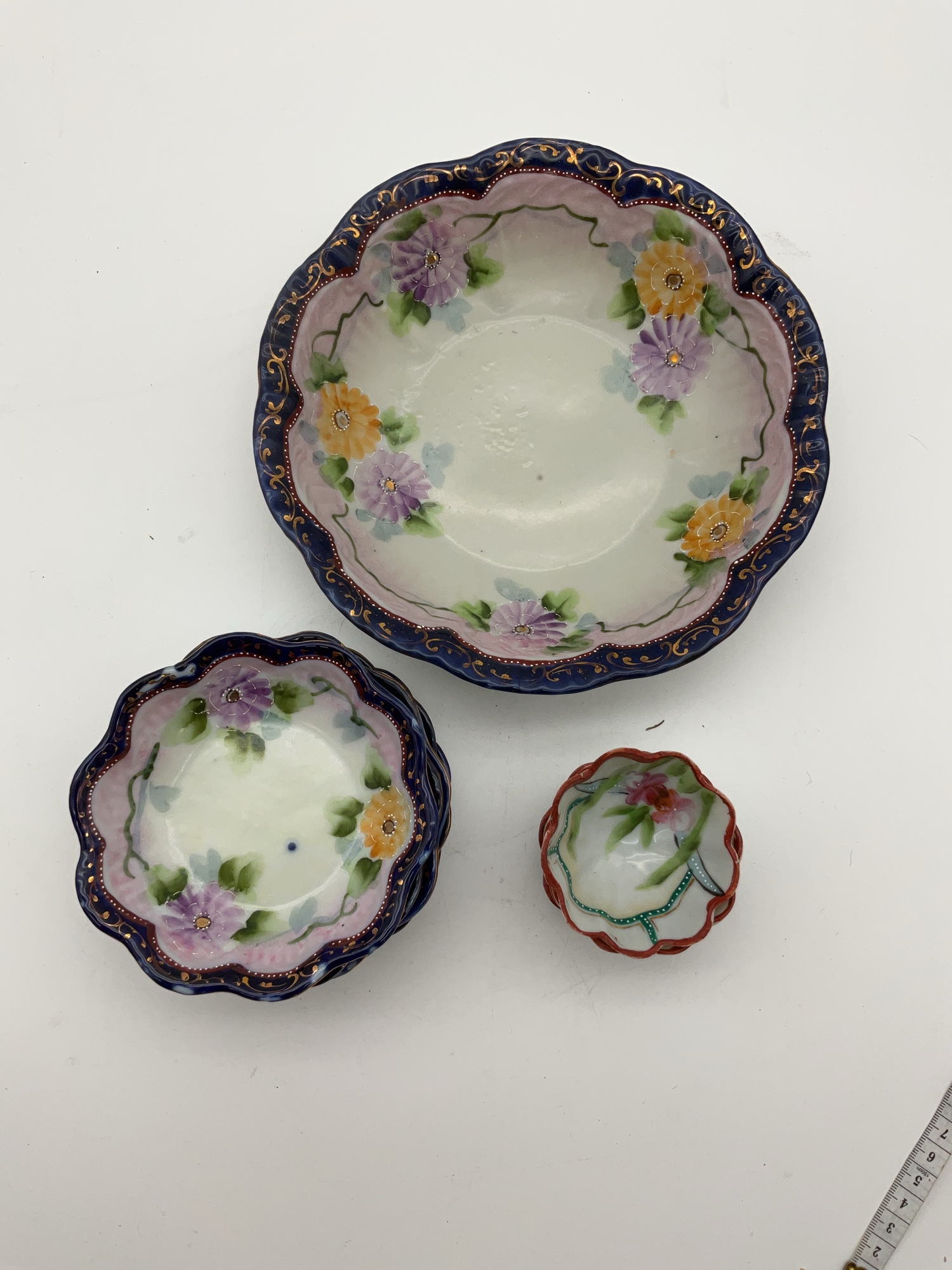 Collection of hand painted porcelain serving dishes featuring a floral design. Includes one large bowl (9 inches), five medium bowls (5 inches), and four small bowls (2.5 inches).