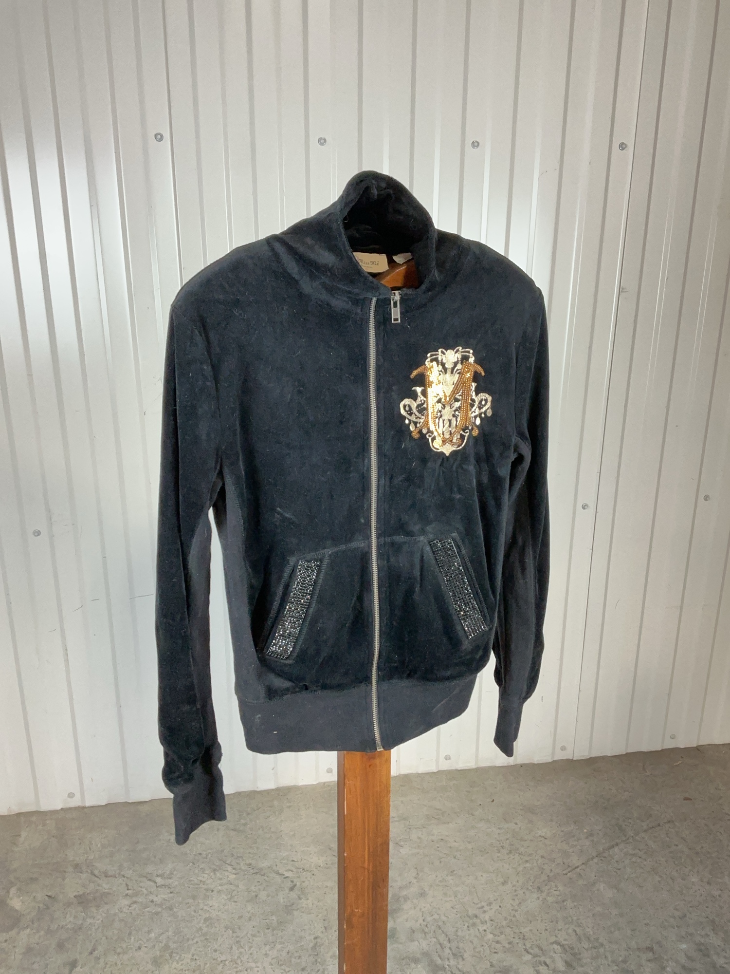 Miss Me black velour jacket, size medium, with fleur-de-lis design on back and jeweled accents. Good condition