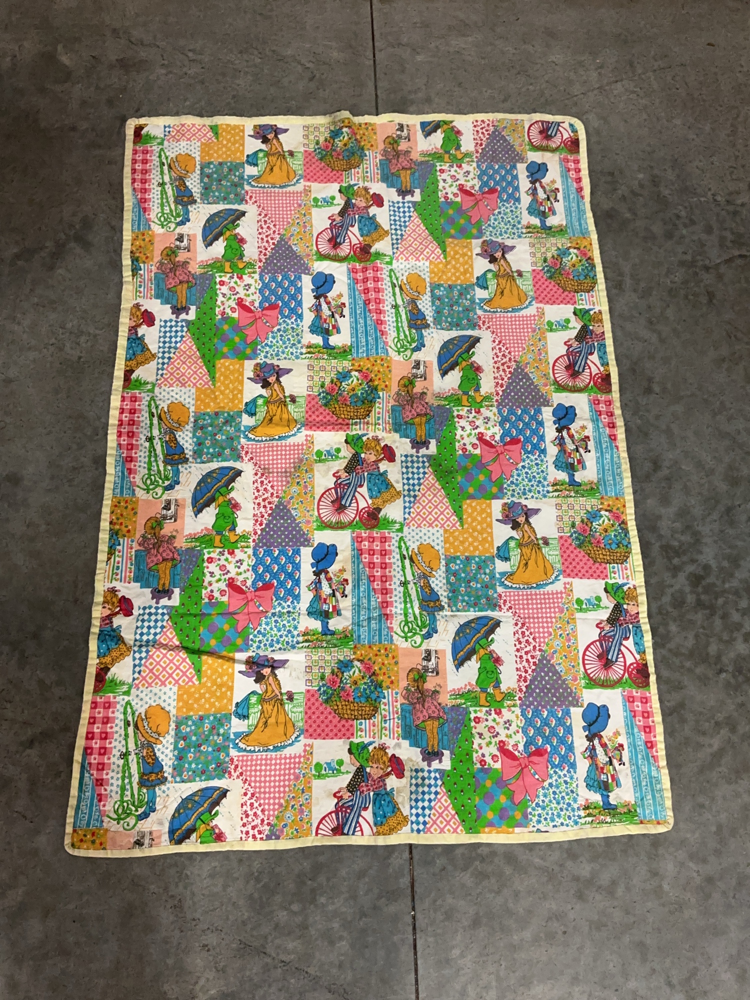 Vibrant patchwork quilt featuring an array of charming children's designs. Dimensions are 41x60 inches. Please note that there are multiple soil spots present.