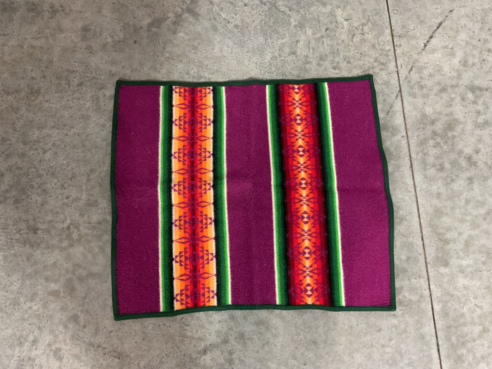 Woven purple rug featuring a geometric pattern with colorful accents. Measures 27x31 inches.