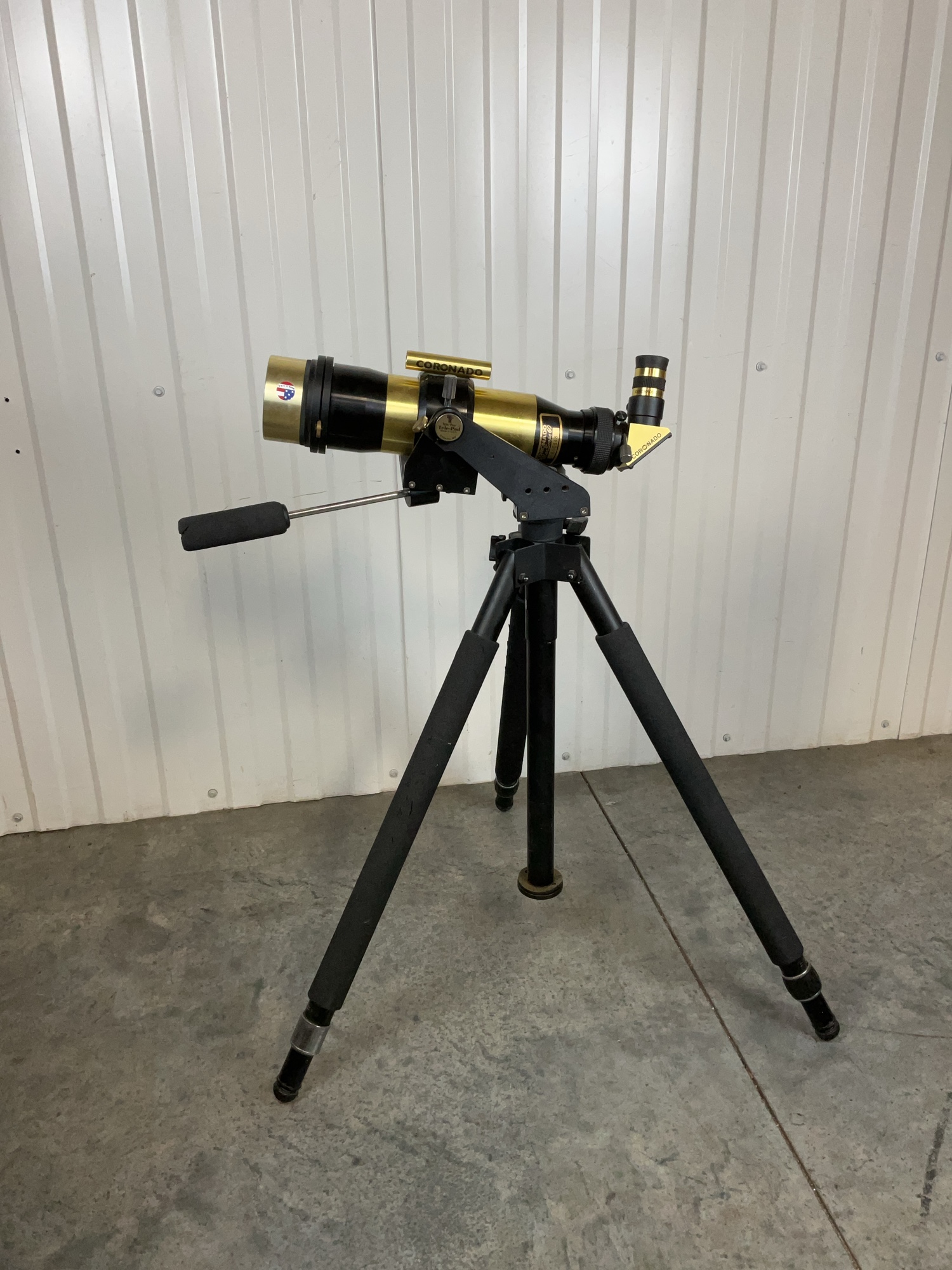 Coronado Solarmax 60 Telescope, featuring a black and gold finish and comes with its tripod. Telescope 17x3.5 stand extended to 41 inches.