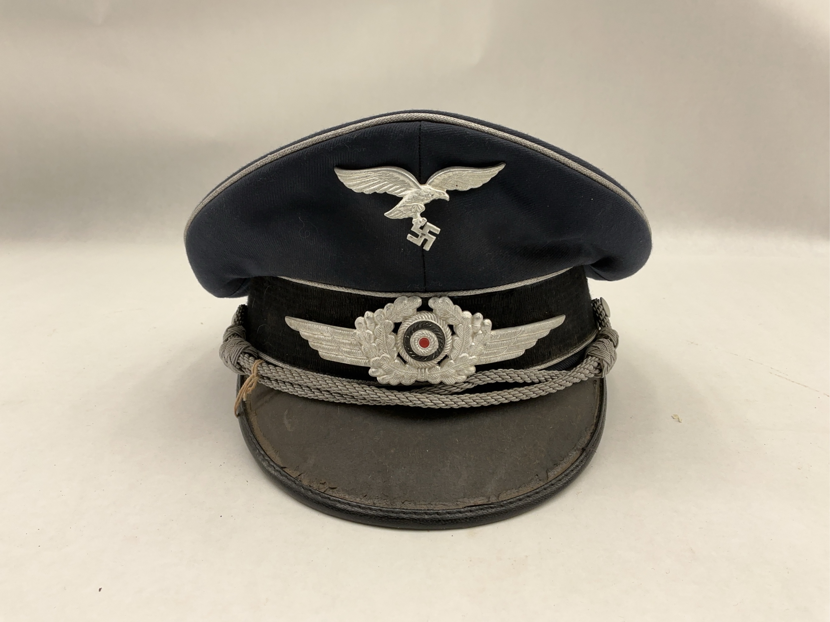 This is a WWII German Luftwaffe Officers Cap Reproduction. Marked with the maker Albert Kemper KG Uniformmutzenfabrik Wiesbaden 22. Size 6b.