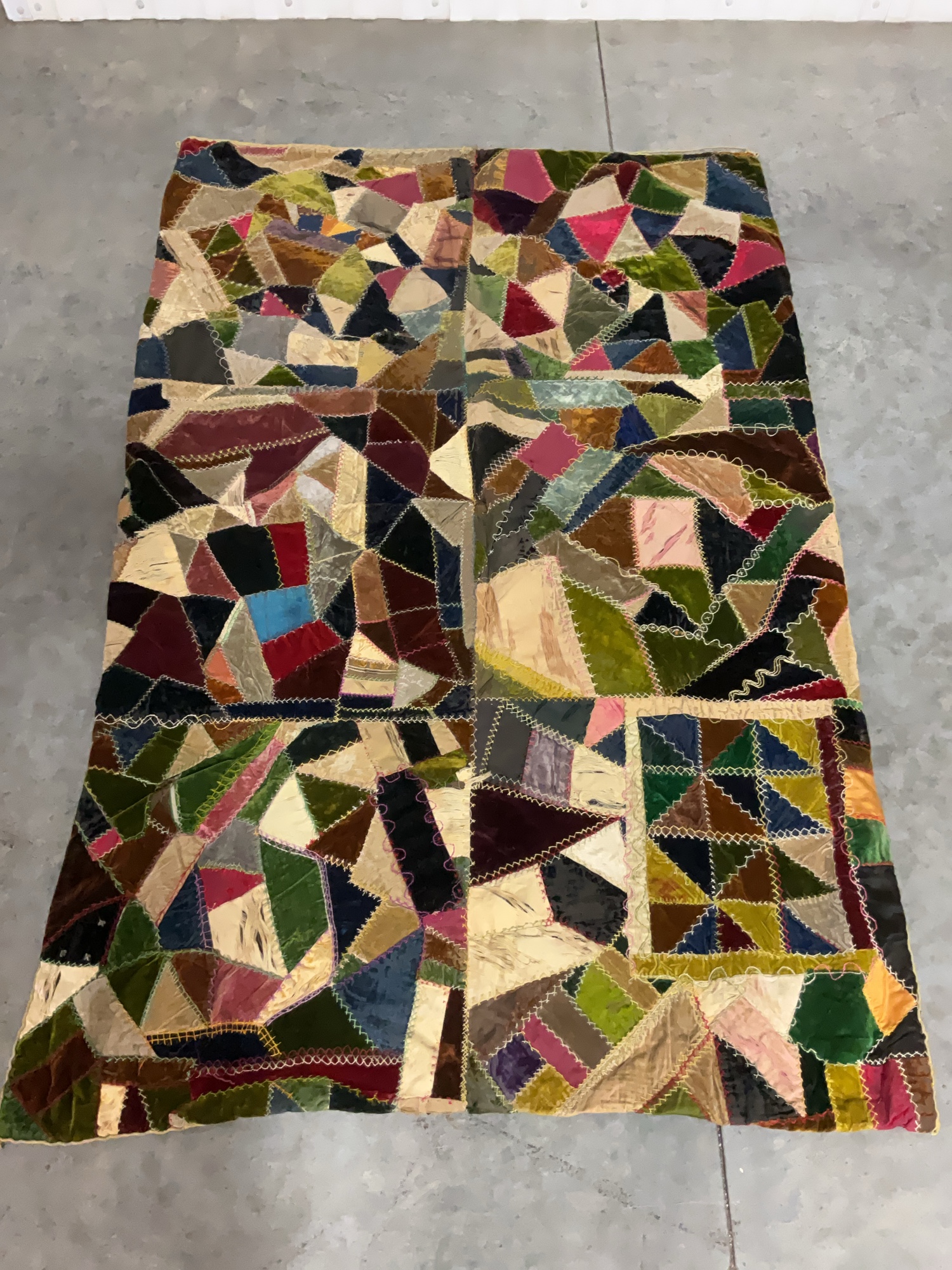 A colorful blanket made of a geometric patchwork design. It measures approximately 42x67 inches. Some fabric is frayed, and the edging is detached on one corner.