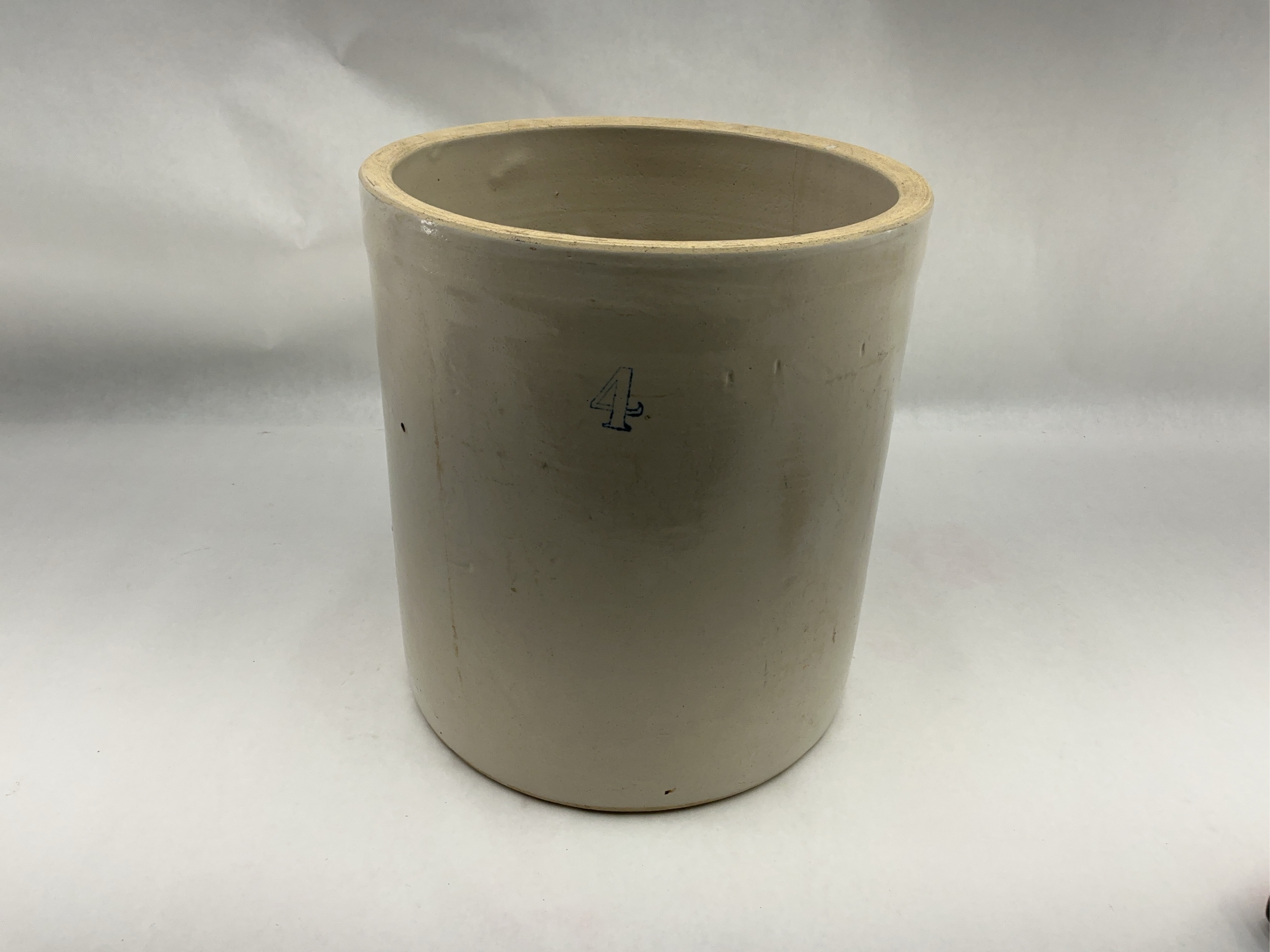 Tan stoneware crock featuring a number '4'. The crock measures approximately 12 inches in diameter and 12 inches in height.