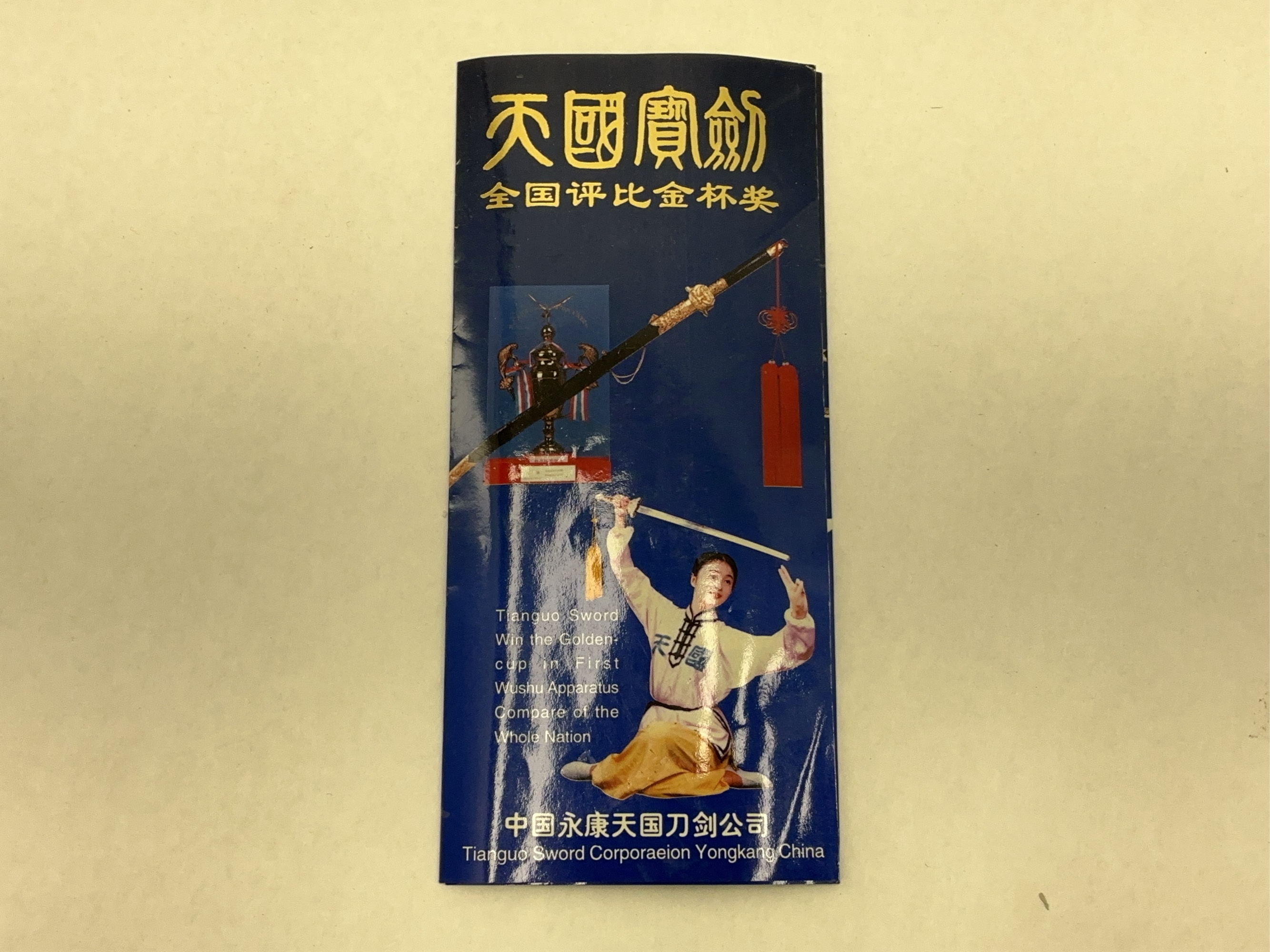 This is a TianGuo Sword from Yongkang China. It features detailed etching on the blade depicting a phoenix and a dragon. It comes with its decorative sheath and yellow tassels. It has the TG-1018 marking.
