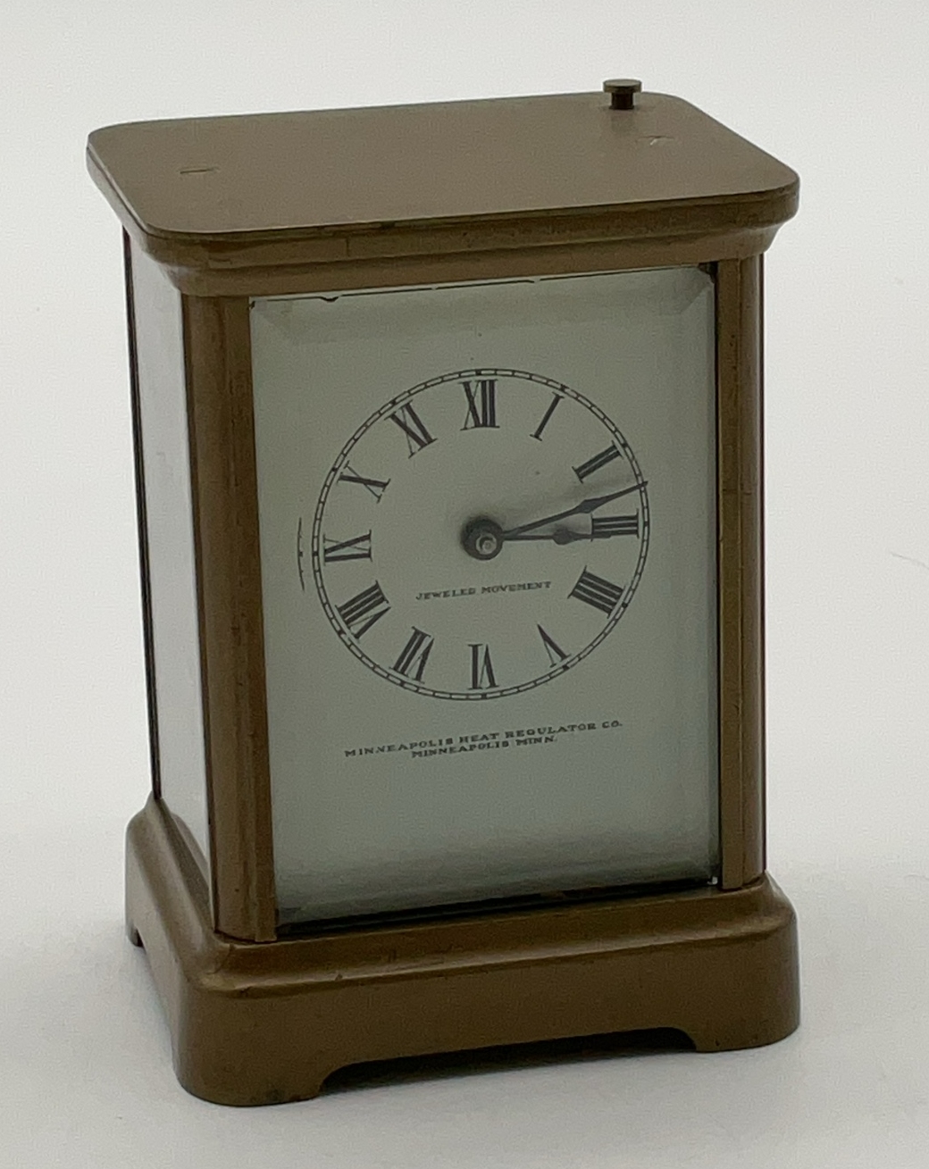 Desk clock with a jeweled movement. Marked Waterbury Clock Co. U.S.A.. Patented Jan 29, 01, Apr 11, 05, June 4, 07. Measures 3x2.5x4.