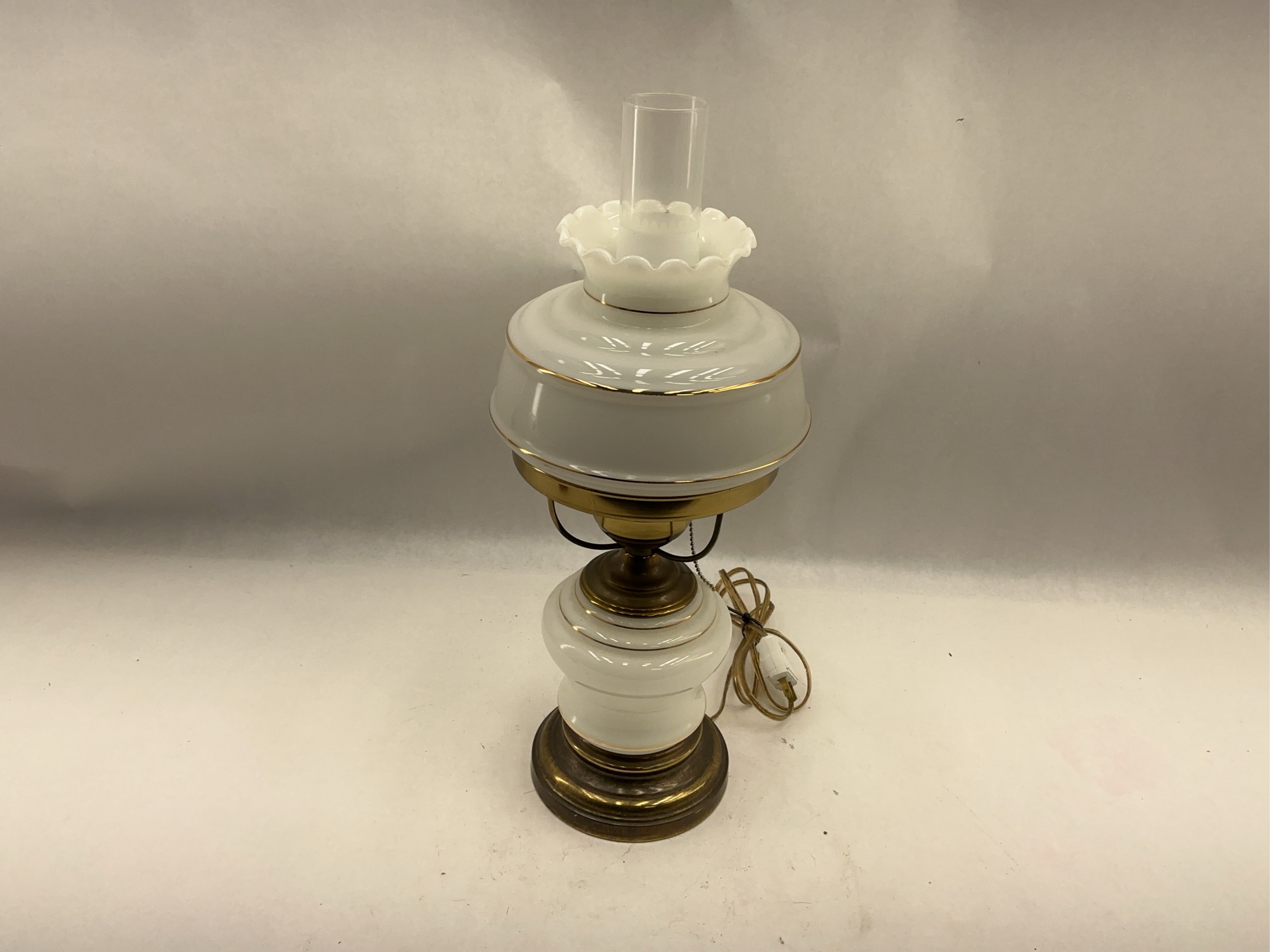 Elegant white glass lamp with brass accents. Features a decorative glass shade and base. Measures approximately 7 inches in diameter and 22 inches tall.