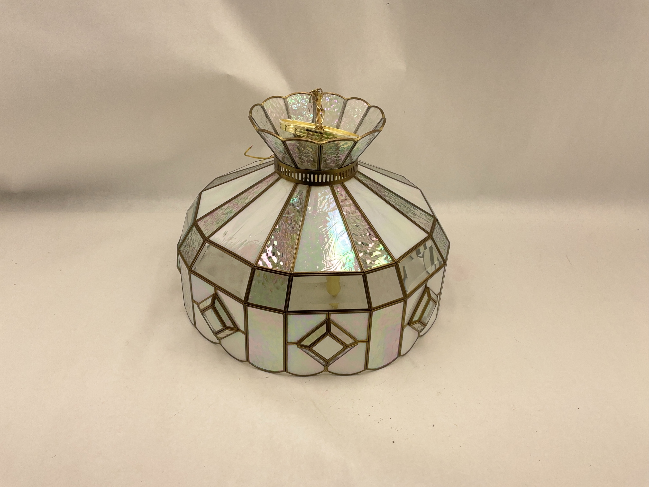 Decorative hanging lamp featuring an iridescent stained glass style design. The lamp measures approximately 24 inches in diameter and 14 inches in height.