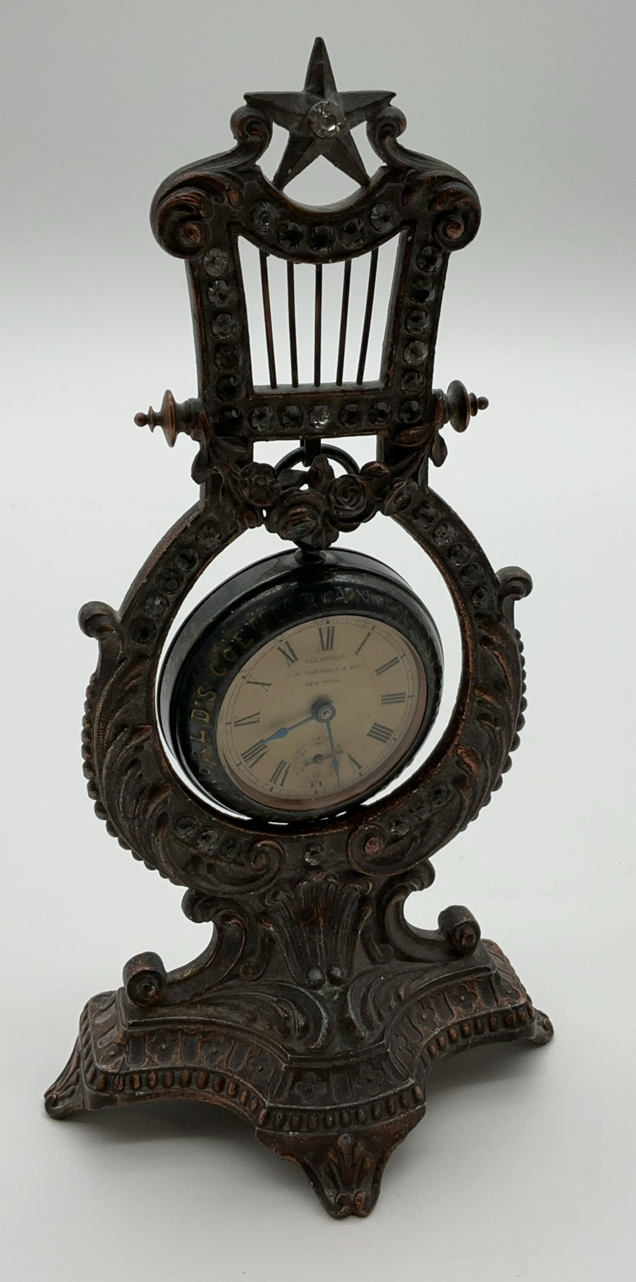 Here is a Columbus World's Fair 1893 pocket watch mounted on a decorative metal stand. Watch can be removed from the stand. Approximate dimensions of the stand are 5x3.5x9