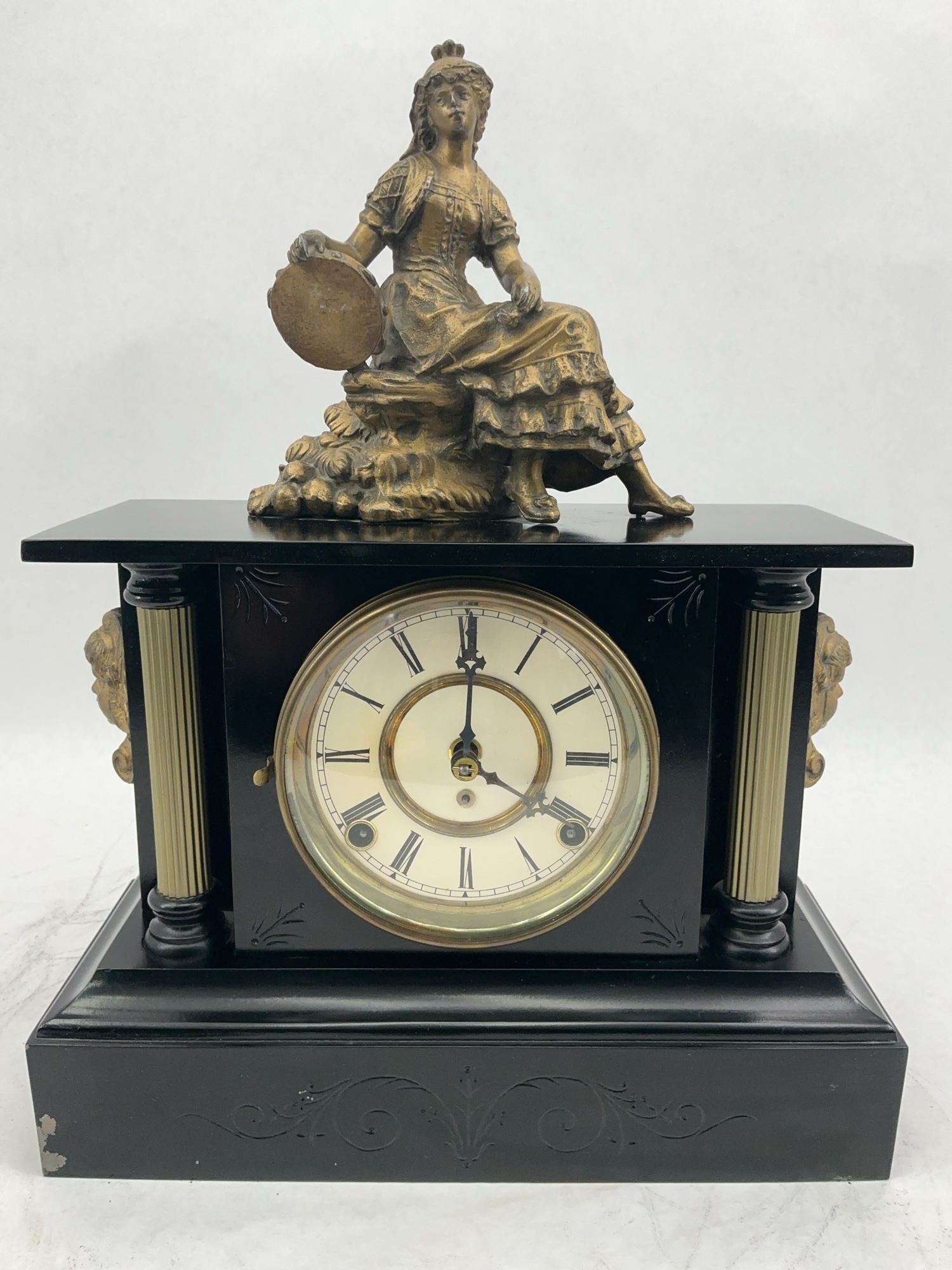This is a marble mantle clock, measuring 12 x 5 x 16 inches, featuring a bronze figurine on top. It does not include a key or pendulum.