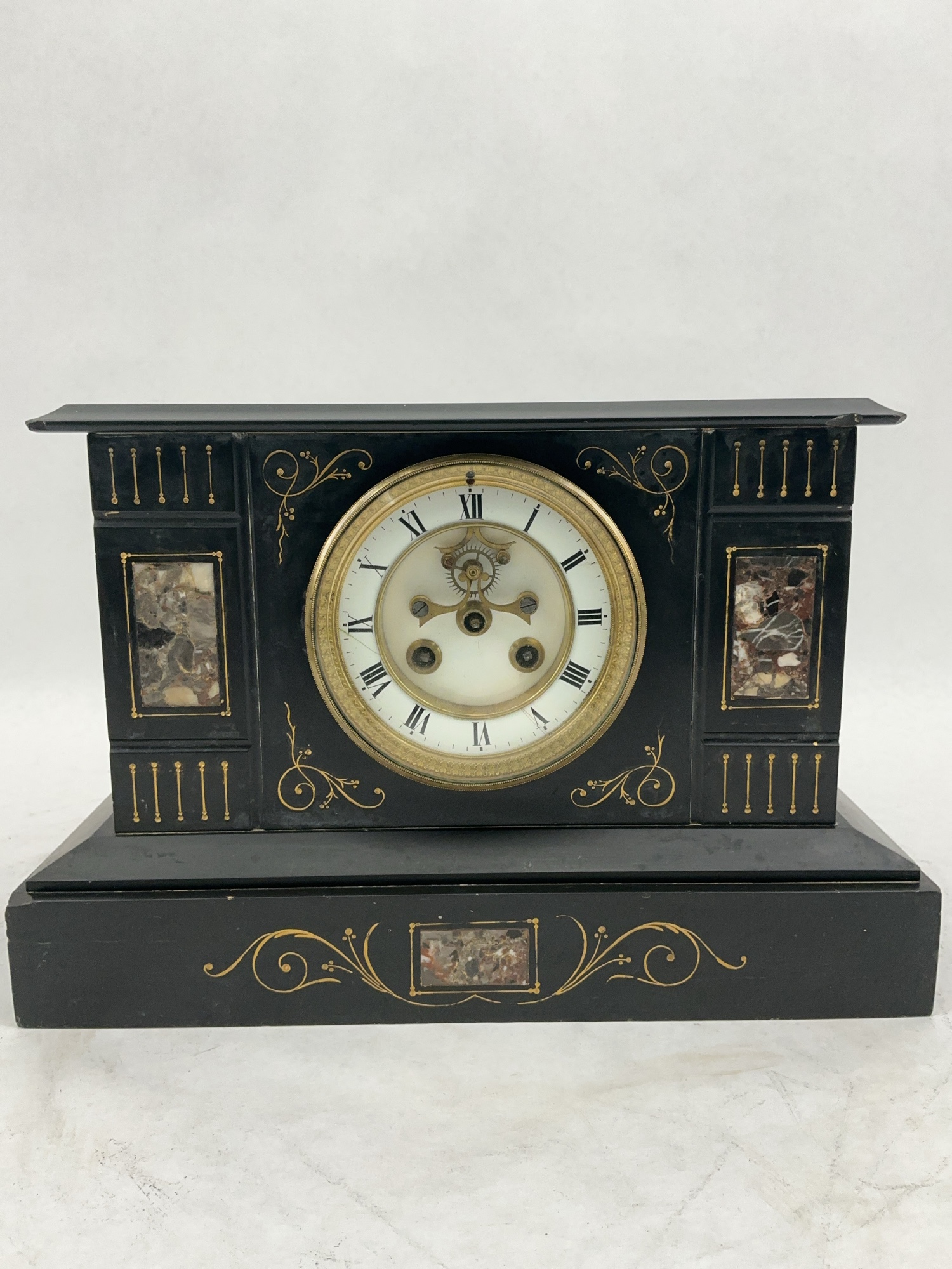 Marble mantel clock measuring 12 x 6 x 8 inches. This clock is being sold for parts or repair. Please note that the clock does not include a key or pendulum. The clock face is unmounted, and there is no covering for the back. There are also chips in the marble.