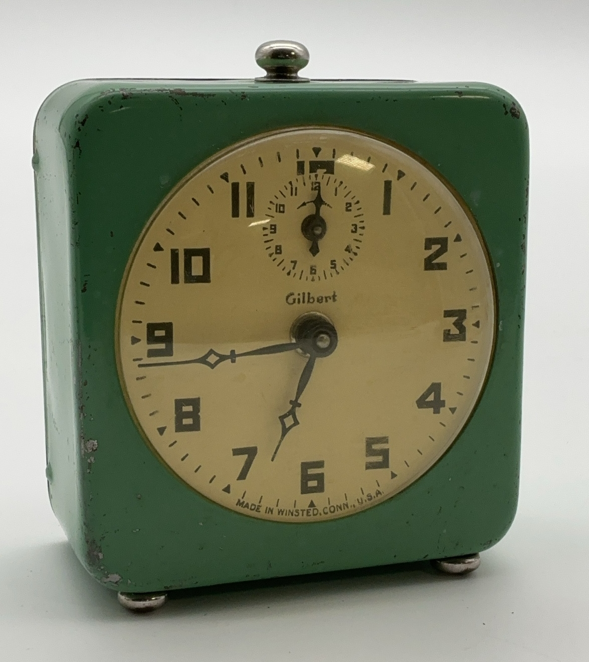 This is a Gilbert brand alarm clock. It features a green metal case and 'Patents Applied For' markings. The dimensions are approximately 3.5x1.5x3.5 inches.