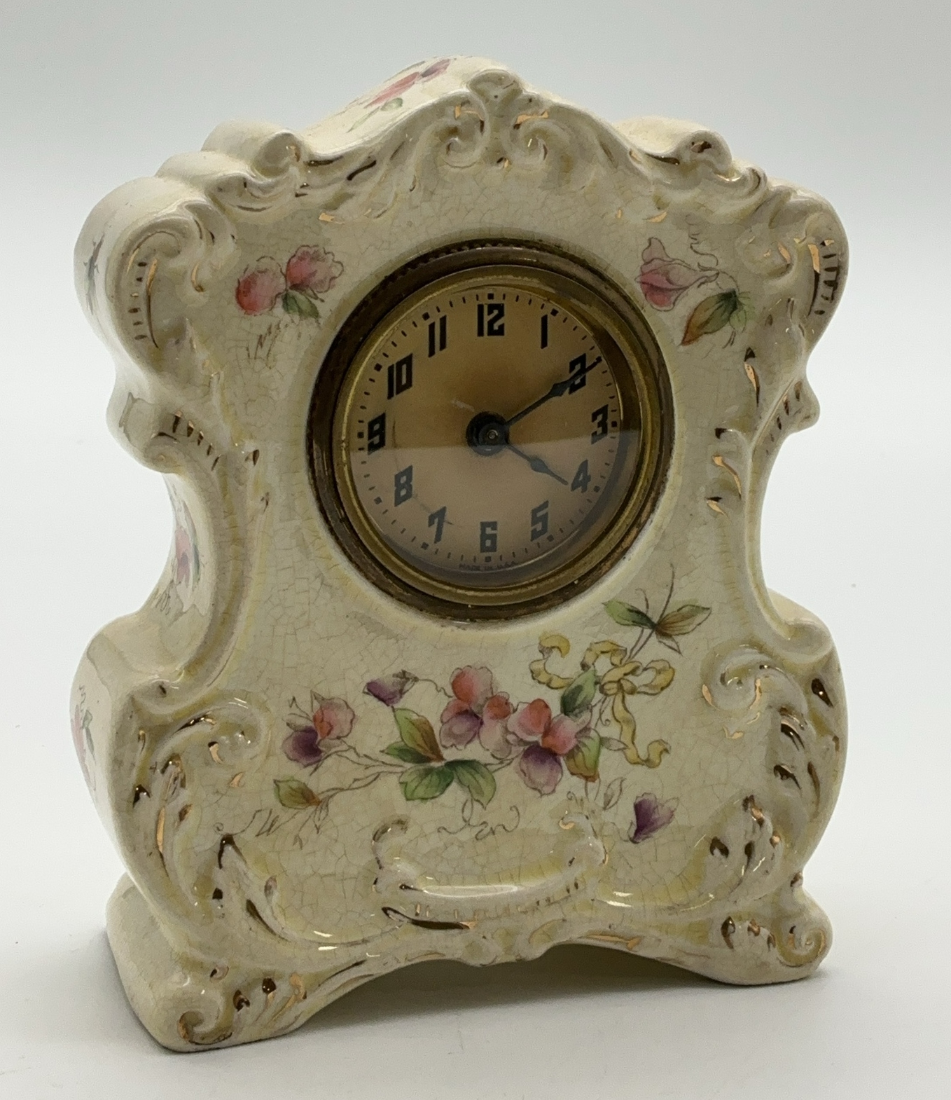 Ceramic mantel clock featuring a floral painted design and a Made in USA mark. Measures approximately 4.5x2x6 inches.