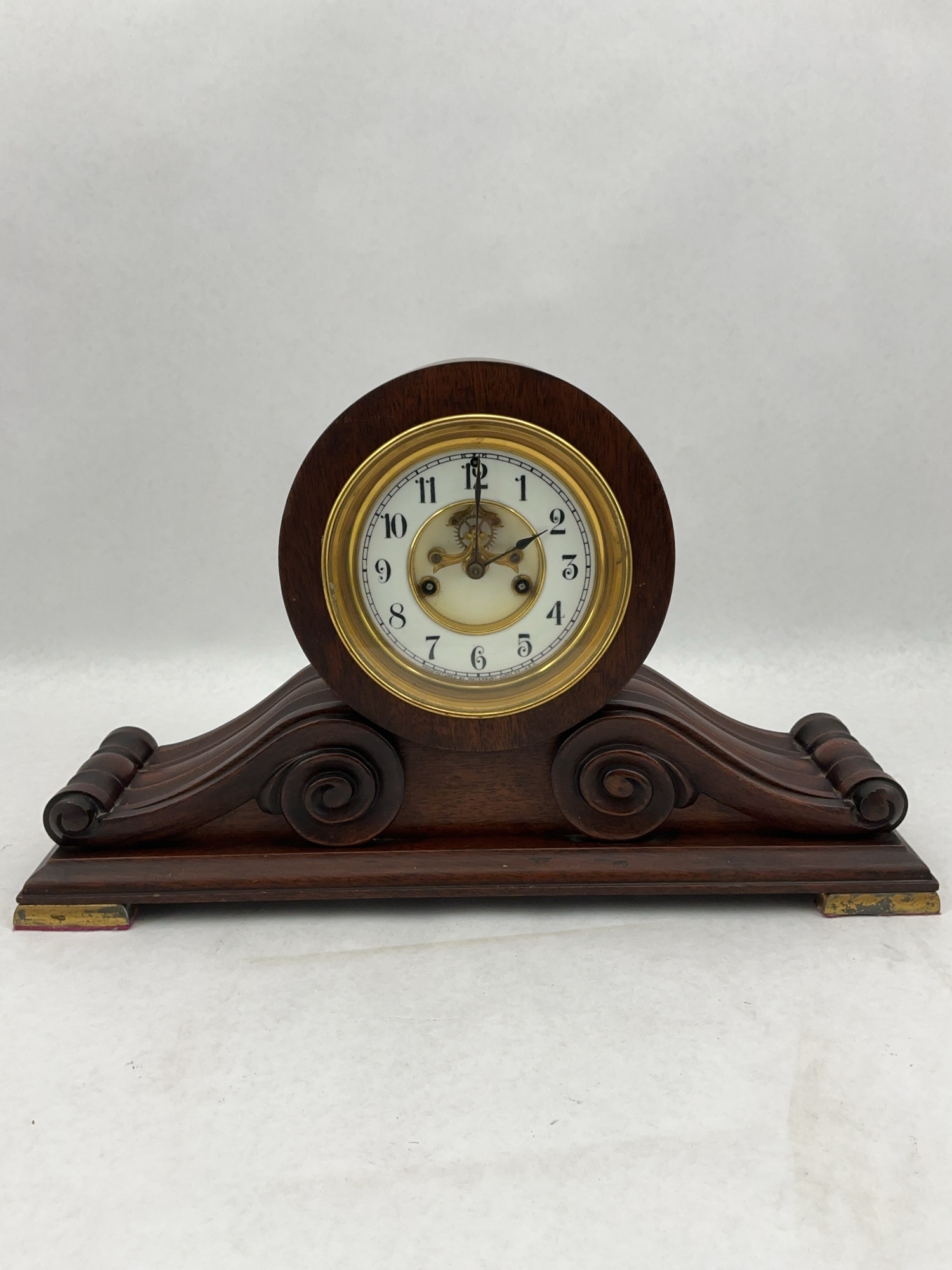 Wood tambour mantel clock made by Waterbury Clock Co., U.S.A. Dimensions are approximately 18 x 4 x 11 inches. Includes pendulum, but no key.