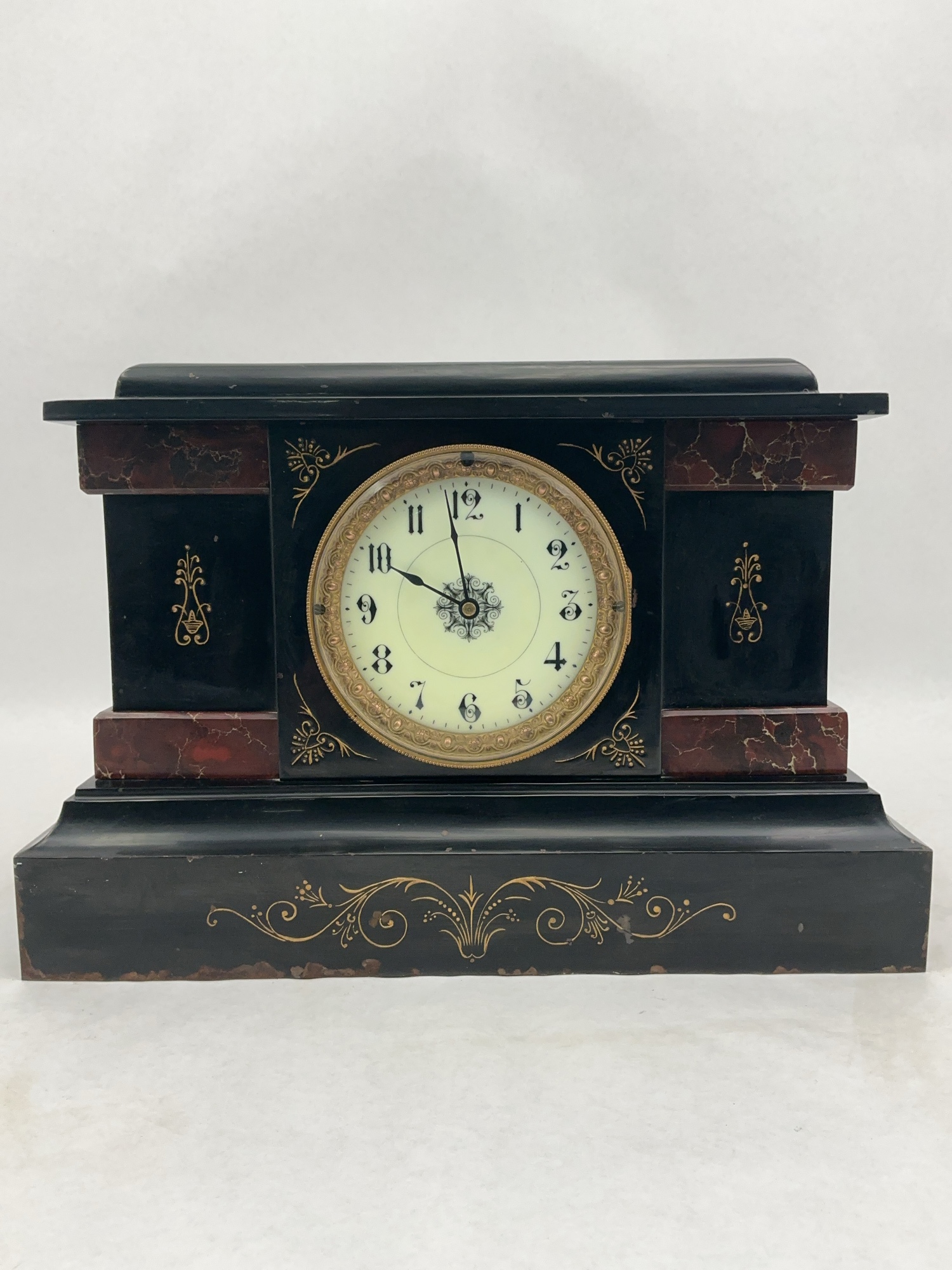 Marble mantle clock, measuring 16 x 7 x 11 inches. No key included. Comes with pendulum. Does not tick. Paint chipping present on top.
