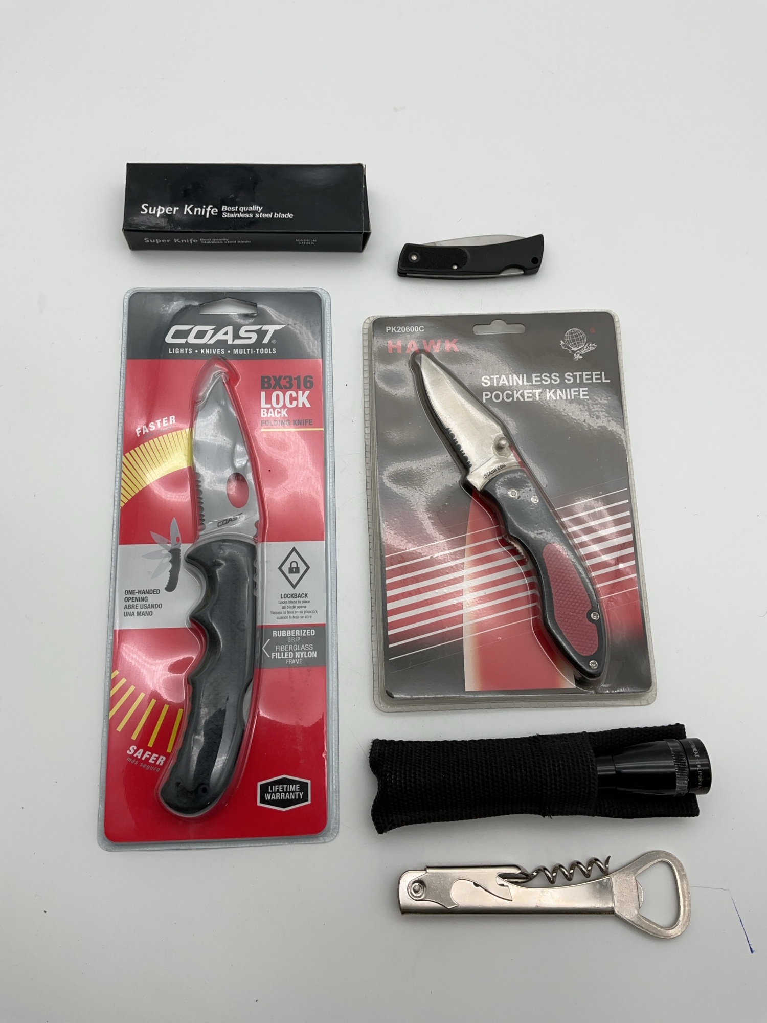 Pocket Knives, Corkscrew, and Flashlight Bundle
