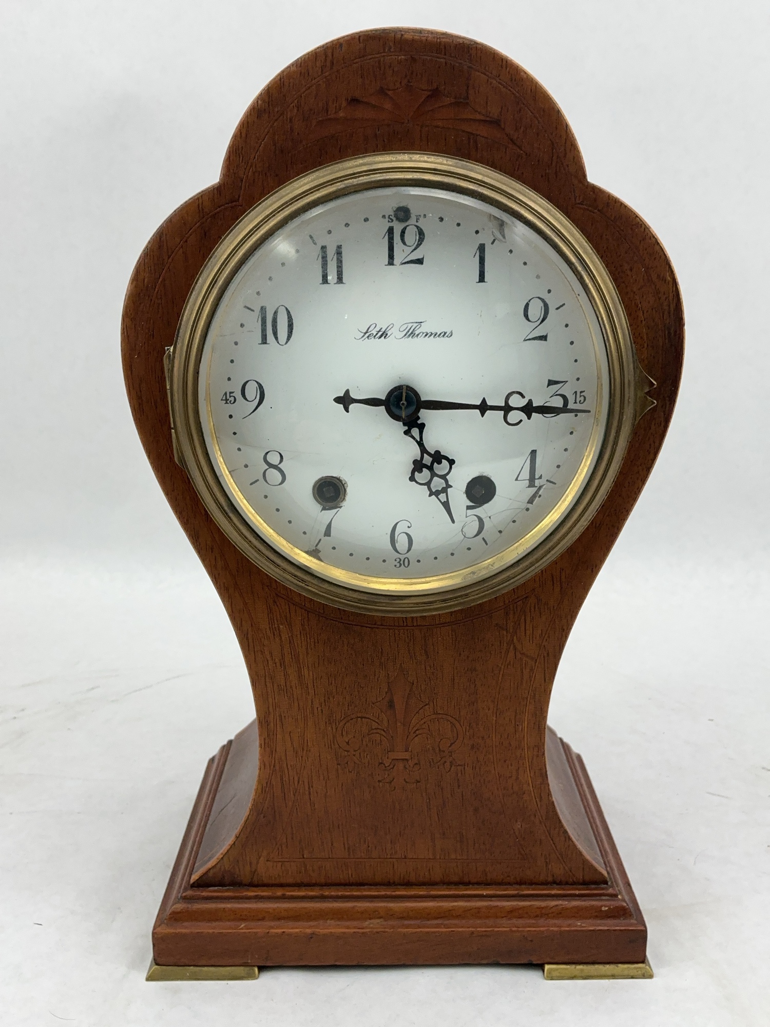 Wood mantel clock, measures approximately 7 x 4 x 12 inches. Comes with a key and pendulum, and the clock ticks.
