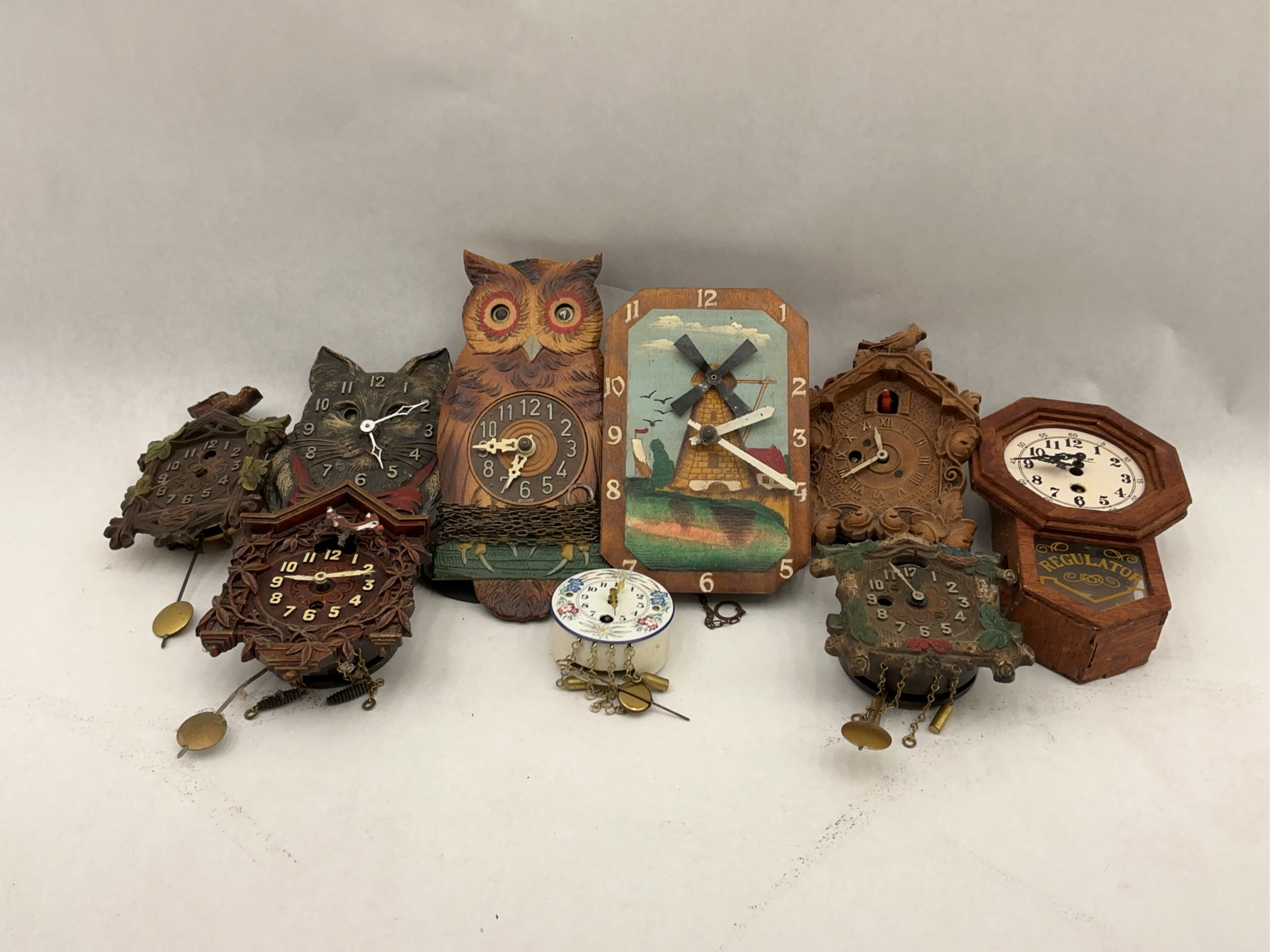 Collection of various decorative clocks, including cuckoo, owl, and windmill designs.
