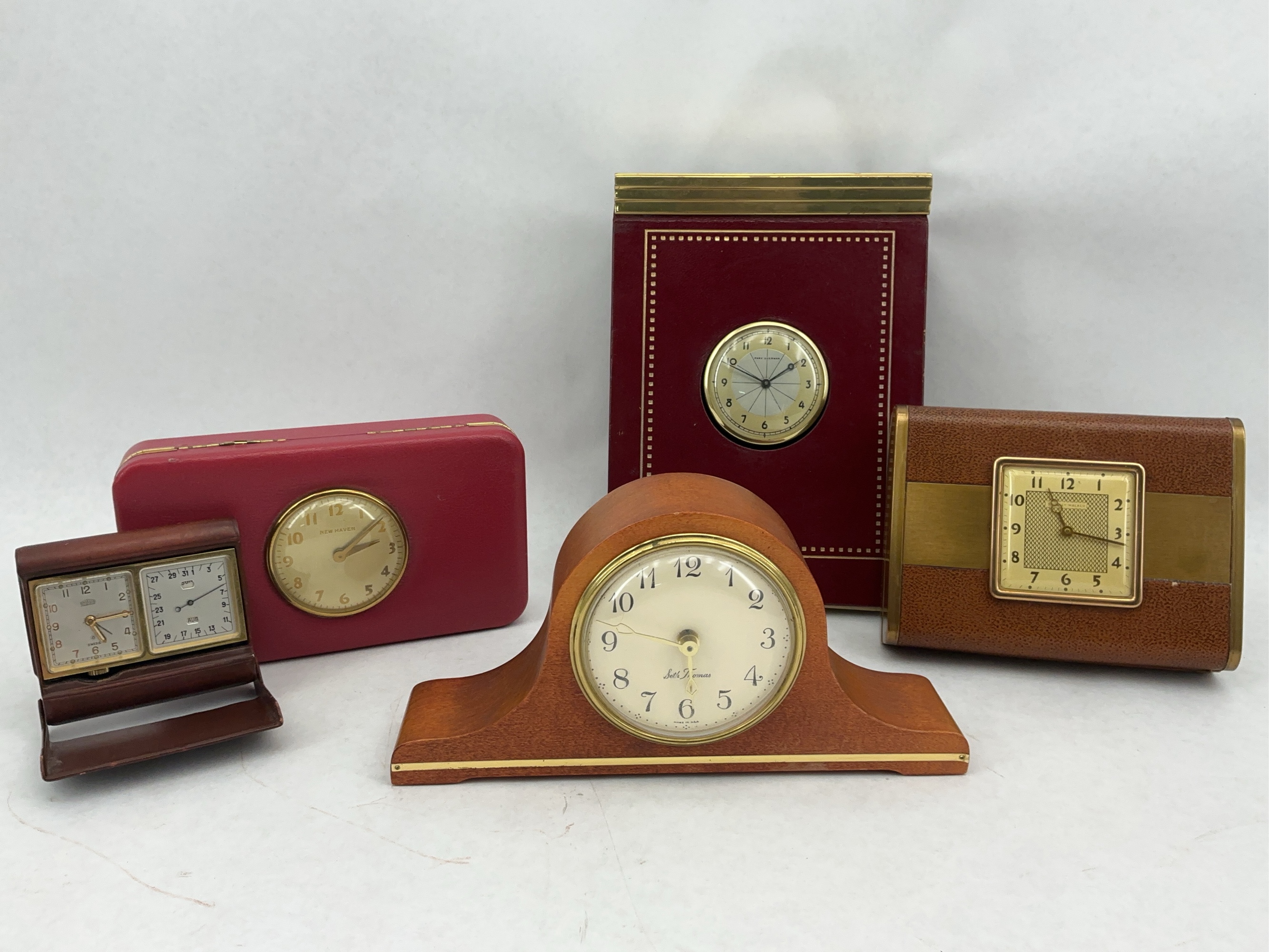 A group of assorted clocks, including a Seth Thomas Mantelette, Farrington, and others. Untested.